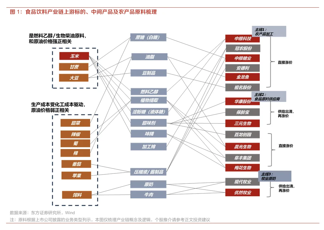 “直接提价”优先,“倒逼供给出清”次之。本轮食品饮料产业链上游行情的核心驱动因素为大宗农产品价格上行,但本质分为两类:1)一类是大宗农产品成本上行带来的供给侧出清,在短期内原料成本上行倒逼二线产能退出,给龙头公司提供盈利空间;2)第二类是受益于品类稀缺或工艺/牌照壁垒,行业具备较强的价格传导能力,公司可以直接提价,且商品价格上行空间大于成本上行幅度;相对而言,具备直接提价能力的板块业绩兑现更快,估值更易抬升。