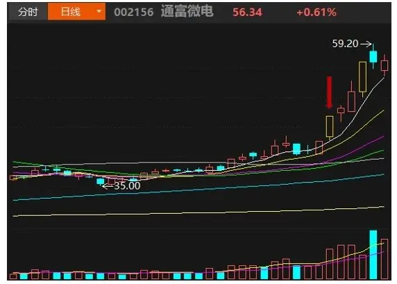 第三个买点则是常见的五日线买点,一个标的涨停之后,后续承接住了,价格打到五日线附近发生了反弹,那么这也是一个买点。为了便于大家理解,我就以通富微电这支标的为例,为大家讲解一下趋势股的三个买点。