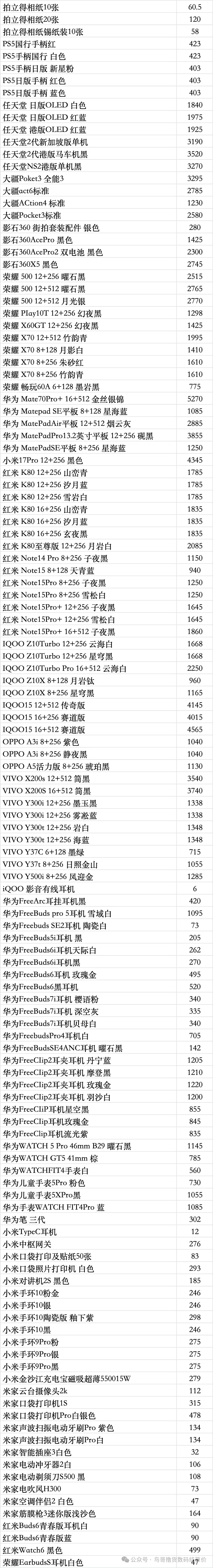 任天堂游戏机: 新款二代NS2港版标配机:3270 新款二代NS2港版马车机:3520,没游戏码:3270(注意下单要看有没有游戏码的 要不然就是便宜的) 新款二代NS2新加坡版 台版 单机:3190,就是没有游戏的 新款二代NS2韩版 欧版 美版 单机:3160,就是没有游戏的 新款二代NS2新加坡版同捆:3480,没游戏码:3170 NS2港版宝可梦同捆:3600 OLED屏 日版白-25年生产日期1850,非25年-30 彩色-1975 OLED屏 港版白-1815 彩色-1930 OLED屏 国行白-1640 彩色-1640 OLED屏 朱紫港版-1940 日版-1940 OLED屏 喷射港版-1940 日版-1940 健身环国行-145 海外版-350 LITE日版 港版 蓝:1045,黑粉1045,绿黄1045 注意区分,这些就不是oled屏的 价格以下(续航版) NS续航国彩-1430 黑-1310,拆封-50 NS续航日彩-1550 黑-1470 长款-30 索尼PS5游戏机 (PS5都要留好纸箱带来,以免破坏品相) 2024新款:PS5 PRO日数:4840 2024新款:PS5 PRO港数:5370 2025新款:PS5 PRO国数:4910 2023新款ps5 日版光驱Slim:3290 2023新款ps5 日版数字Slim:2760 2023新款ps5 国行光驱Slim:老款:3110,新款3120 2023新款ps5 国行数字Slim:2510 2023新款ps5 港版光驱Slim:3360 2023新款ps5 港版数字Slim:2770 PS5国行手柄:白420,其他420,外版-20 只收跨境 PSP串流机:1345白,1345黑 PS5单国光驱:575,外版525 ROG XBOX : OLED SteamDeck掌机掌上游戏机 512G 美:4060,日港:4060 OLED SteamDeck掌机掌上游戏机 1TB 美:4710,日港:4710 大疆3标准:,全能: 大疆Action4标准:,全能: 大疆ACT5 Pro标准:,全能: 大疆action5pro畅拍: 大疆AC6标准: 大疆AC6畅拍: 大疆NEO标配:,全能: 大疆OM7P:,om7: 大疆 mic1拖1:,1拖2: o4图传: 拍立得MINI12影像花室套装:,外版,一次成像礼盒装 拍立得SE国行:,白色: 拍立得相纸20张:121,10张:60.5 拍立得锡纸装10张:58 任天堂 手柄 NS左右手柄:370 NS2左右手柄:420 NS2 PRO 黑柄:420 PRO国黑柄:310,外版280只收跨境 PRO乱斗柄:330只收跨境 PRO王泪柄:330只收跨境 PRO喷射柄:330只收跨境 PRO异度柄:330只收跨境 3月15 行情参考 大疆pk3标准2580 大疆pk3全能3290 大疆ac4标准1245 大疆ac5标准1880 大疆ac5畅拍2400 大疆ac6标准2785 大疆ac6畅拍3240 大疆nano 64 :1720 大疆nano128:2020 大疆o4pro图传1460 (26年一月份的不要) mini一拖二 455 云台8 单机 490 云台8 标准 660 【大疆系列只收待更新状态的机器 后封/在保代卖或扣款】 影石acepro一代1435 影石go3s 64 黑白1430 影石go3s 128 黑白1630 影石acepro2单电黑2250 影石acepro2单电白2310 影石acepro2双电黑2305 影石acepro2玩拍套装3425 影石x5标准黑2755 影石x5全能3300 影石go ultra黑2155白2155 影石go ultra人气套装2415 影石aceproPro2 街拍黑 275银 285 影石128内存卡220 影石256内存卡380 影石512内存卡640 遮光罩80 2026年3月15日 华为配件全系列 行情参考 以结算价为准 所有货都不收国补的,一经发现就当送我们的 华为手表系列 华为 Watch FiT4 黑565白560绿565紫560银590 华为 Watch FIT4 pro 黑1135蓝1095绿1175 华为WATCH FIT 2活力款 黑色320粉320 华为WATCH FIT 3 黑430灰505月光白425原野绿455粉435薄荷绿445蓝435珍珠白495 Watch D2 黑 2925白2845蓝2845 Watch D2 药房版 2615 Watch buds 黑1135卡其色 1225 GT4 41m 白 765黑695草木绿00 GT4 46m 黑825棕00绿 00 Watch 4 黑 00褐 00白 00 Watch 4pro 棕 00火星钢00蓝00太空探索 00 Watch 5 46m 黑1820紫2165棕 2270蓝1875钛空银 2545 Watch 5 42m 黑1685白1820杏2325绿1715金2355 非凡2 黑4945蓝5945 非凡手表 黑3355蓝 00绿00 华为新款WATCH GT5系列 GT5 46黑1045蓝930棕875灰905 GT5 41 黑 885蓝815白845青835棕785 GT5pro 黑1145陶瓷2105钛钢色 1355冰川白1015 GT6 pro 黑1820棕2125钢2525 GT6 46m黑 1095灰色 1265绿色 1405 GT6 41m 黑 950棕色 1400白色 1210紫色1025蓝985 华为儿童手表系列 儿童4pro蓝495粉500 儿童5pro 蓝740粉725绿725紫735 儿童5X 蓝695粉720 儿童5Xpro 黑1055紫1110 儿童5 绿360紫360蓝415活力蓝335红330 儿童5星耀 粉410蓝425 荣耀手环,华为手环 荣耀手环9标准黑94蓝105紫100 荣耀手环9NFC 黑120蓝120紫120 荣耀手环10标准黑137绿137灰137蓝137 荣耀手环10NFC 黑155灰155绿155蓝150 华为手环系列 华为手环8标准黑105粉108 华为手环8NFC 黑108 华为手环9 黑160白145粉143黄 140蓝145 华为手环9nfc版 黑165白150粉150蓝150黄148 华为手环10标准 黑165粉168 华为手环10铝合金款 黑168白173蓝170紫170向新绿165原野绿160灰165 华为手环10NFC 黑195白200蓝195紫200绿193 B7 黑675灰685 华为耳机系列 华为Free Arc 绿400灰420黑420白390 华为 FreeBuds 7i 白338灰333粉338 华为freebuds6i耳机 白260黑268紫257 华为耳机Free clip2 黑1205白1200蓝1205金1210紫1250 华为耳机Free clip 黑色855暖星云870紫 835玫瑰金845 华为耳机FreeBuds 5i 黑203白217蓝217 华为FreeBuds se2 耳机 白70蓝73黑73紫73 华为 FreeBuds se3 黑98金98白98 华为 FreeBuds Se4 白140黑140 FreeBuds 6 白515黑520紫520金495 FreeBuds 4e 2024款 白290银290 FreeBuds pro5 白1095银1115金1095蓝1115 FreeBuds pro4 黑695绿695白695 华为CD56 pro笔 455 华为CD57 黑235白00 华为CD54S 三代笔299 华为 三代笔充电器 79 Wifi5 黑175白175青173 WiFi3 pro 270 AX3 123 AX6 new 250 AX3 pro new 197 AX3 pro WiFi7 187 BE3pro 千兆版 180 BE3pro 疾风版 170 BE7pro 405 AX2pro 105 荣耀手表 荣耀手表4pro 黑695棕745绿745 荣耀手表5pro 蓝牙版黑1105灰1085 荣耀手表5pro 插卡版黑1195灰1195 荣耀手表5Ultra黑1225棕1475钛金属1895 荣耀手表5 黑565金565 移动电源 华为22.5w se 移动电源 黑87白91 华为66w 电源 白180蓝190 |