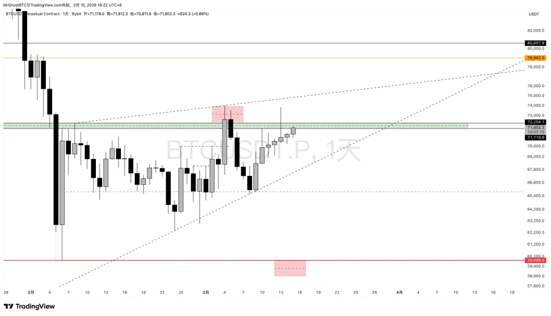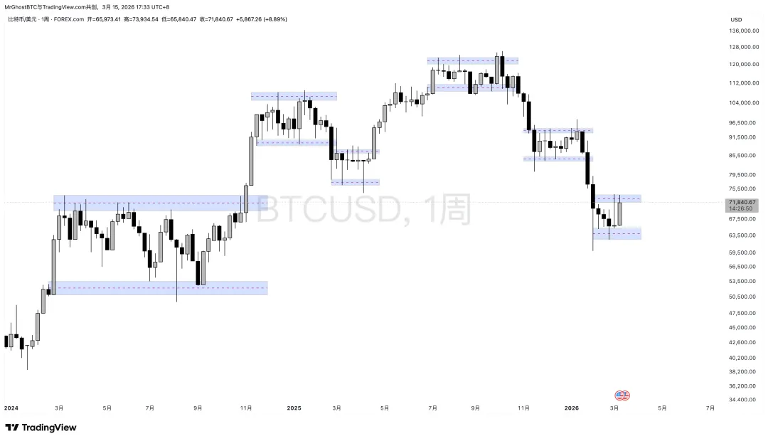 数据显示,2024年初约6万美元震荡至年末近10万美元峰值,后回调至2026年3月约7万美元,验证范围主导结构。