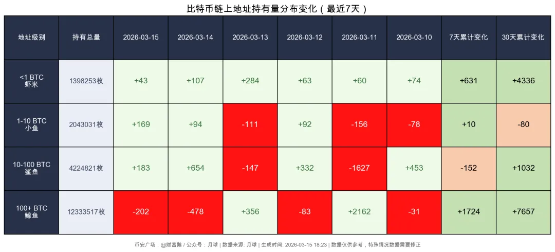 币安2026年3月15日最新期货数据清晰揭示聪明资金(鲸鱼与交易员)策略已从多空方向性押注转向震荡交易。空军整体进一步减仓,平均开仓价持续下降,说明高位空头大量止盈获利,低位空头则选择扛单;而多军同步减仓,平均开仓价上升,部分低位多头也已止盈。