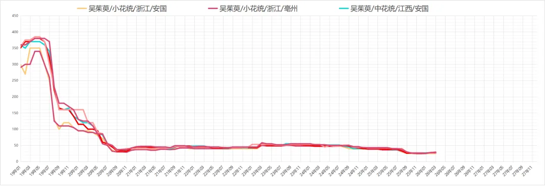 吴茱萸近期市场商家关注力度较强,前期价格较低种植户弃于管理,采收积极性也有所下降,使得连年减产,吸引部分商家关注,但新陈货叠加使其库存供大于求,货源走销仍以实销为主,价格较前期无明显波动,现浙江小花货价格在27元上下。
