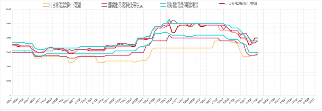 川贝母行情持续低迷,目前市场存量仍较丰,经营商们也多苦无销路,纷纷持仓观望,价格继续保持疲软,现青贝2900元,松贝3600元。