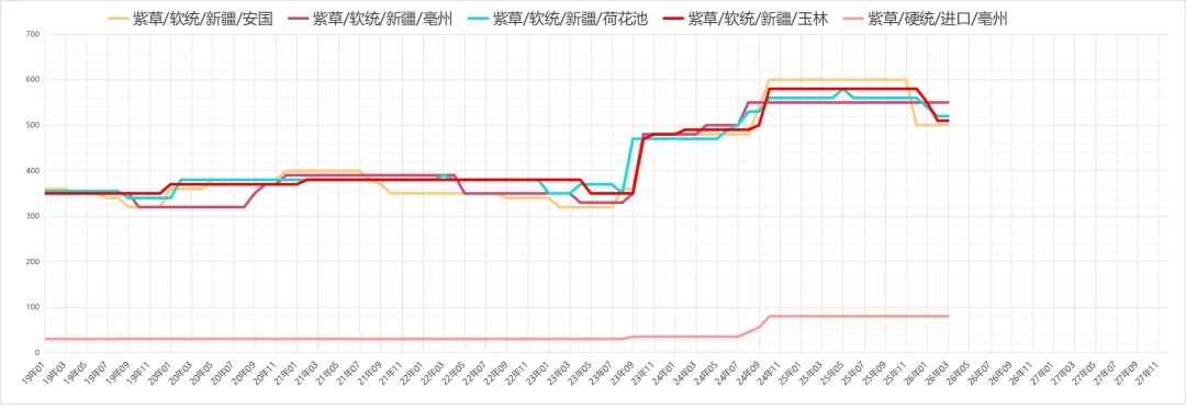 紫草价格上升,紫草受近期中东地区地缘局势紧张影响,进口渠道受阻,国内市场价格随之上涨,现市场价格在80元上下。