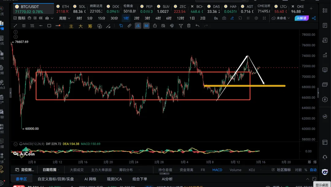 3) 如果1h回调不跌破68000,那么下一笔1h级别反弹还有可能继续冲73000或者更高