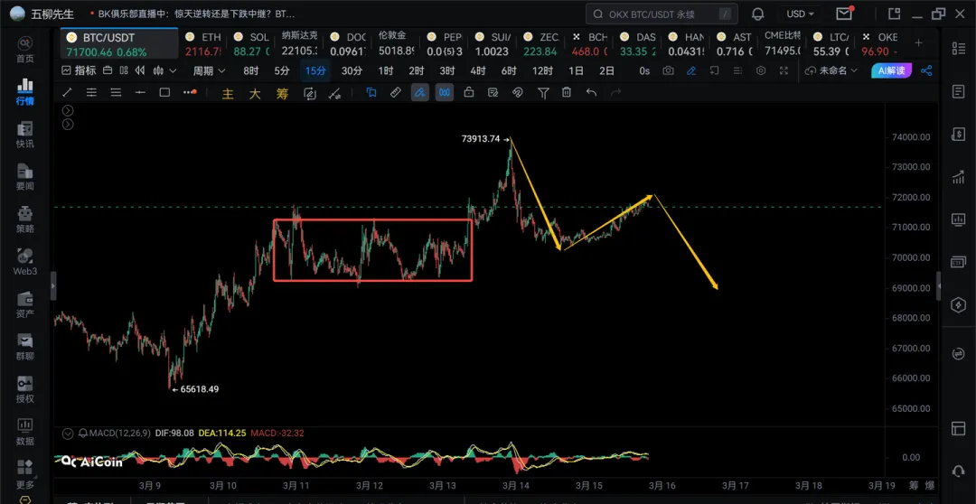 2)目前走出了第一笔15分钟级别的下和第二笔15分钟级别的反弹,预期还有第三笔15分钟级别的下跌,看是否跌破69200
