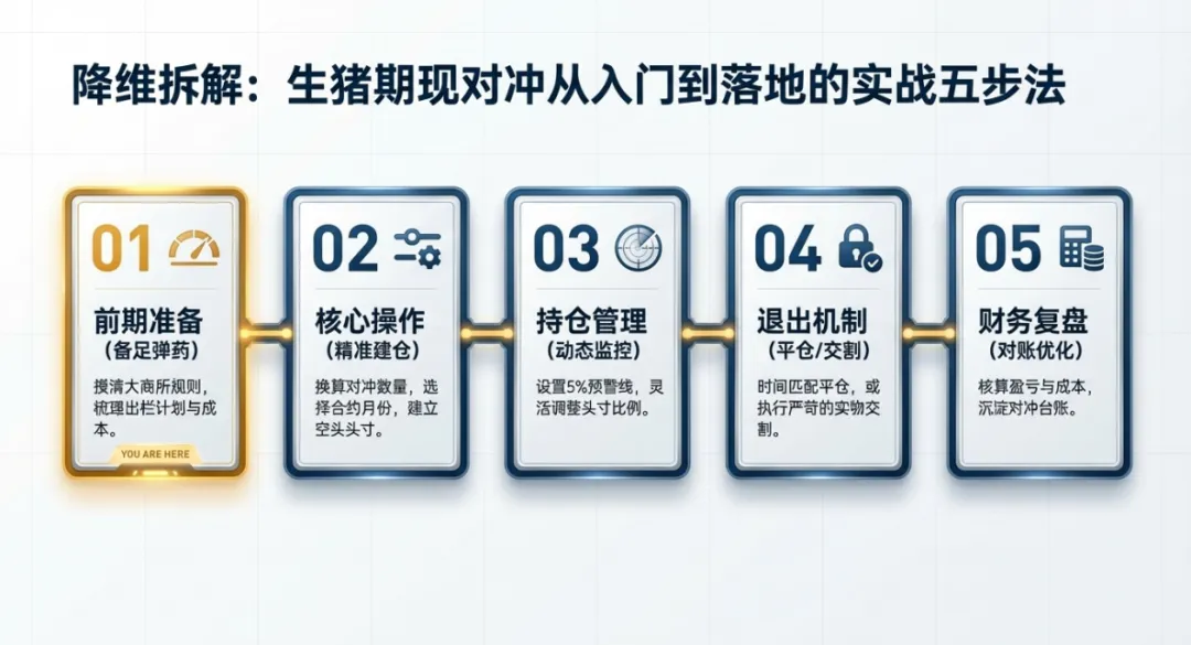1. 平仓操作:生猪出栏当天或前后1-2个交易日内,在期货市场买入相同数量、相同合约月份的期货合约平仓,完成期现对冲闭环。例如,7月10日出栏生猪,可在7月8日-10日期间完成期货平仓,确保两个市场操作的时间匹配。