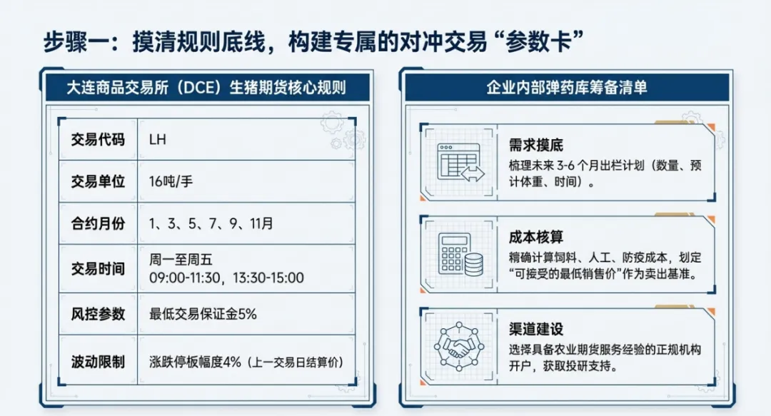 2. 明确自身对冲需求:梳理未来3-6个月的生猪出栏计划,包括出栏数量、预计体重、出栏时间,以此确定对冲规模。同时核算养殖成本(饲料、人工、防疫等),明确可接受的最低销售价格,作为期货合约卖出价格的参考基准。