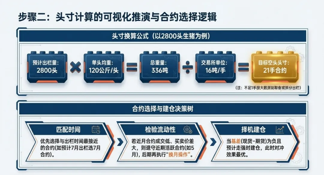1. 确定对冲数量:按“期货合约数量=预期出栏生猪总重量÷16吨/手”计算,不足1手的部分可按实际情况取舍或拆分出栏计划分批对冲。例如,预计出栏2800头生猪(单头平均体重120公斤,总重量336吨),需卖出期货合约数量=336÷16=21手。