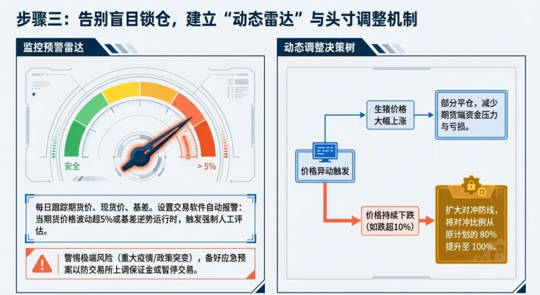2. 合理调整头寸:若生猪价格大幅上涨,可部分平仓减少期货市场亏损;若价格持续下跌,可适当加仓扩大对冲覆盖范围。例如,原计划对冲80%的出栏量,当价格下跌超10%时,可将对冲比例提高至100%。