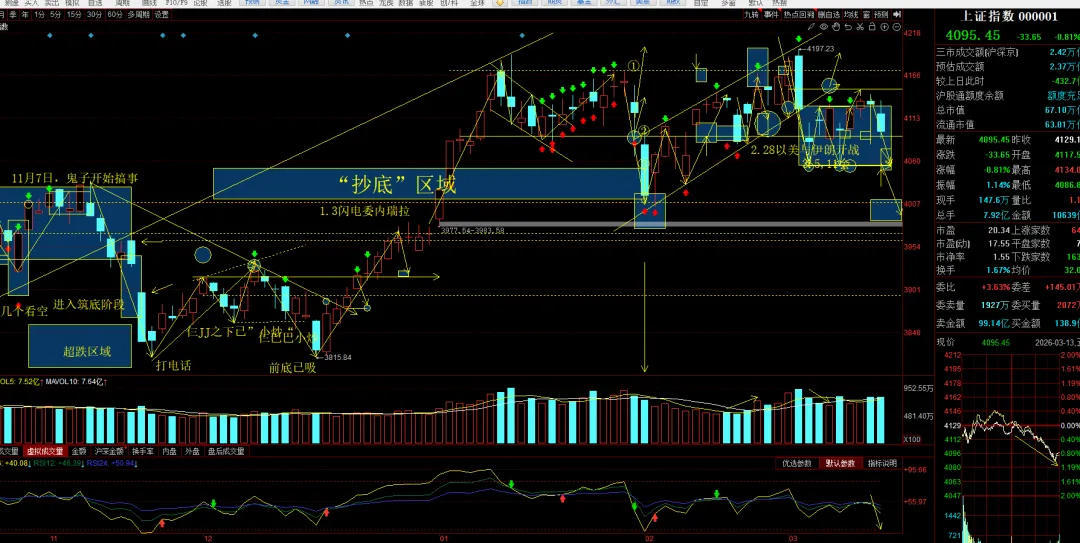 不太理想,虽然低开下探回升过,但是午后突然跳水,跳水也不是因为什么重大利空,是近期主流的几大热点比如AI,电力,电网设备等出货兑现所导致,但是行情打断了之前的低开日内高走或者回升的节奏了,那么调整在所难免了,回头看小周期的“双底”形态无法构成了,而是一个4050~4150的区间震荡了,短期行情如若弱势可能会再度回踩4050,整体是一个宽幅震荡区间内。