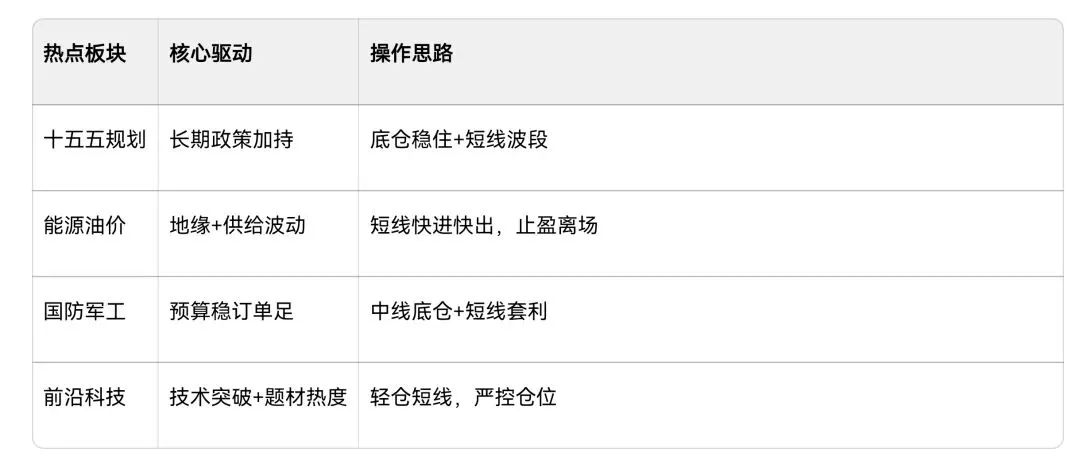 本文仅为市场热点逻辑梳理,不构成投资建议,不推荐个股。短线务必设止盈止损,底仓优先选政策靠谱赛道,拒绝纯概念炒作,轻仓滚动操作更适配当前行情。