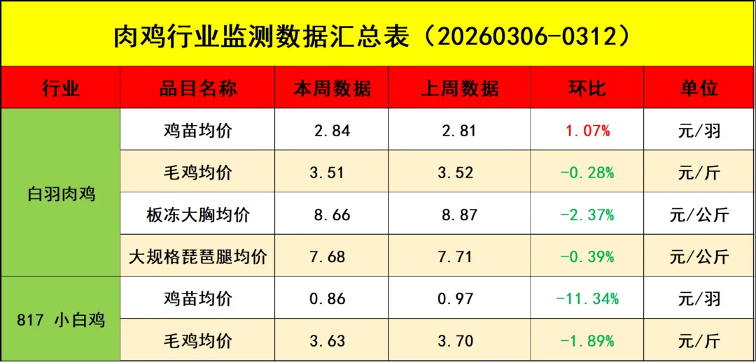 本周白羽肉鸡产品综合售价均下跌,其中板冻大胸周度均价8.66元/公斤,与上周均价相比,下跌0.21元/公斤,跌幅2.37%;大规格琵琶腿周度均价7.68元/公斤,与上周均价相比,下跌0.03元/公斤,跌幅0.39%。