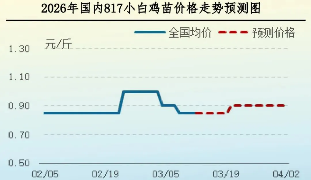 本周国内817小白鸡鸡苗周度均价0.86元/羽,与上周均价相比,下跌0.11元/羽,跌幅11.34%。