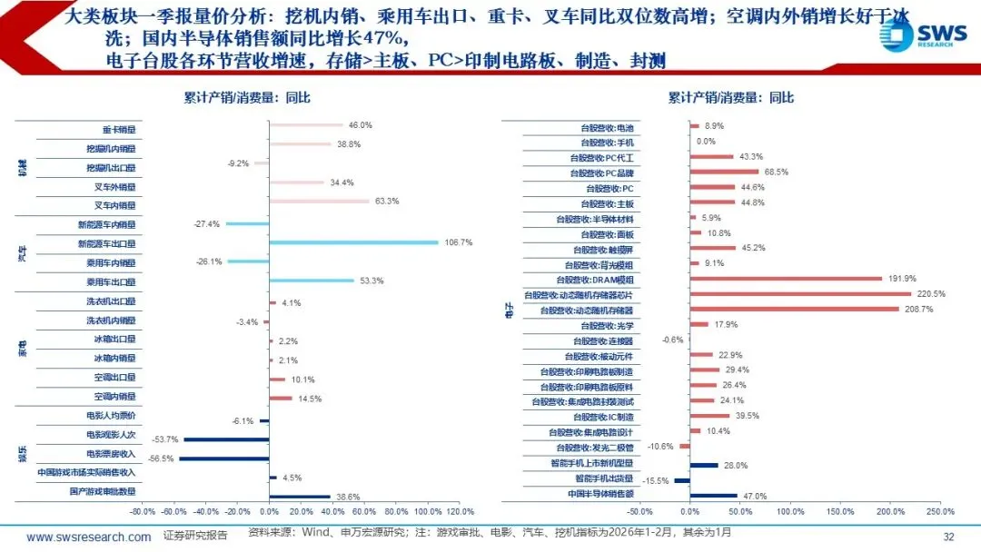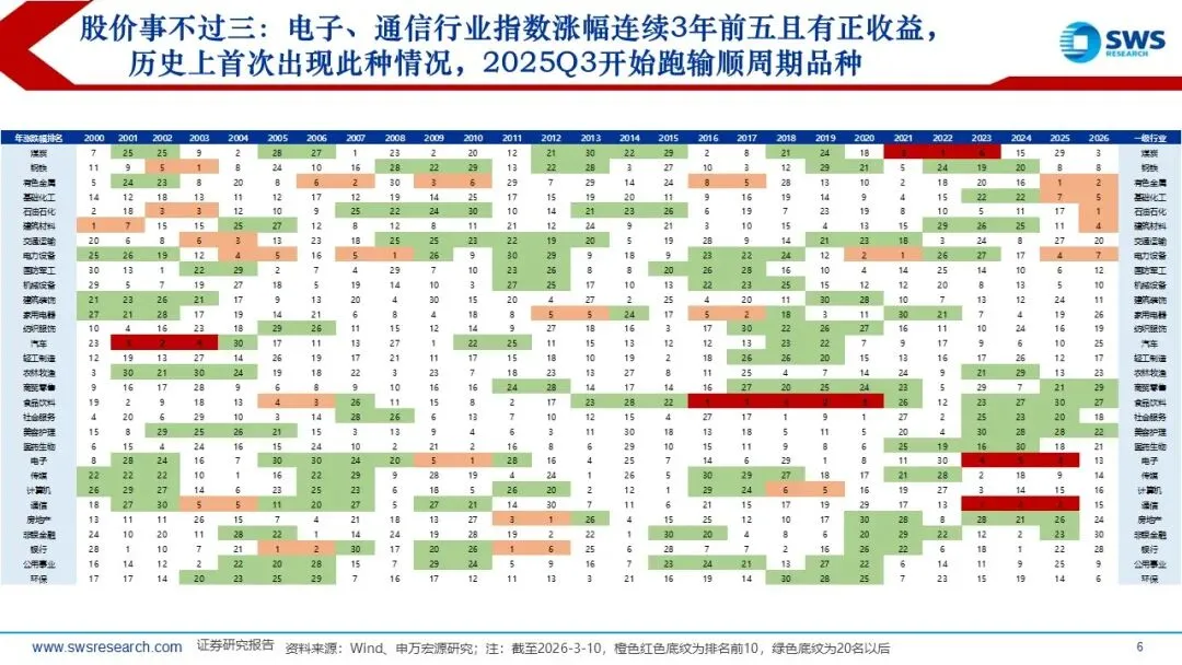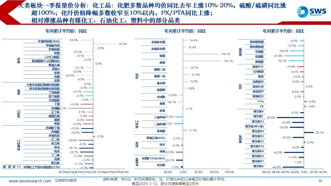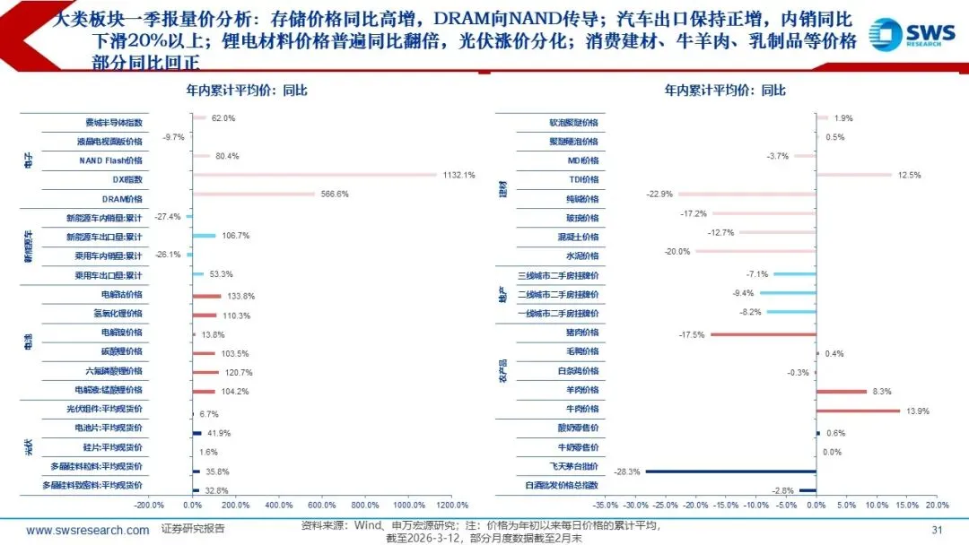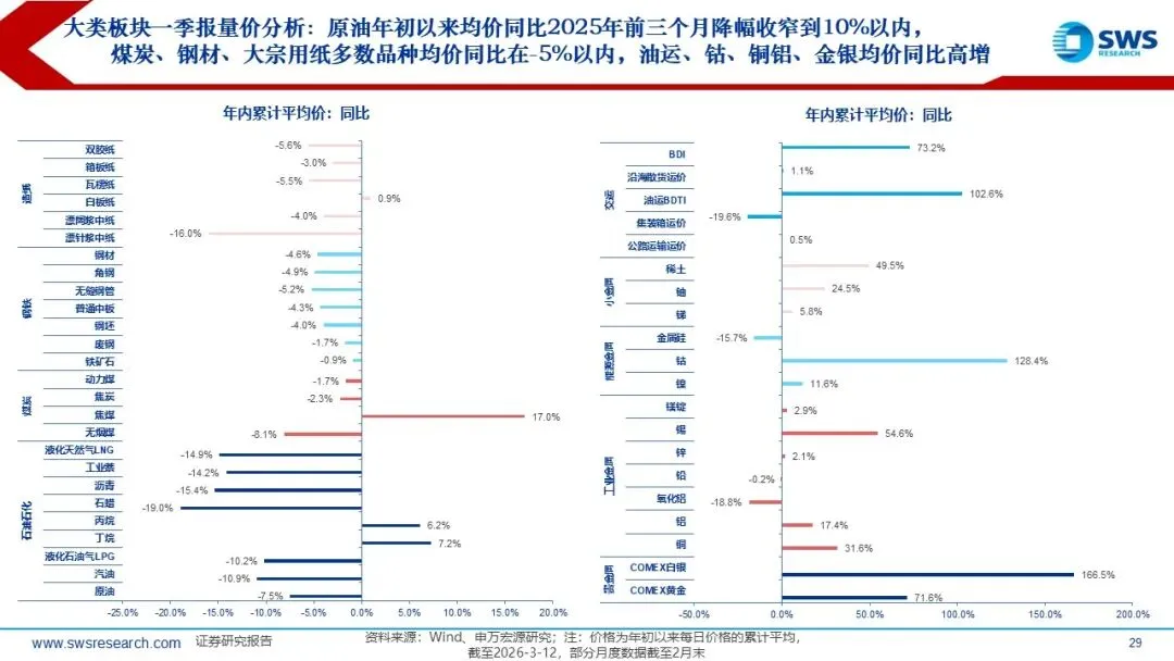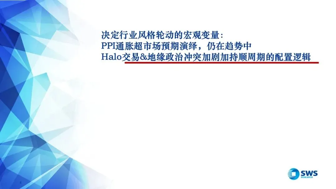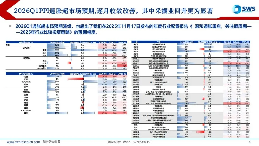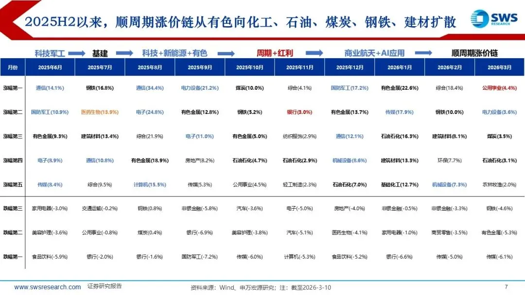 一、市场交易特征: 2026Q1通胀超市场预期演绎,也超出了我们在2025年11月发布的年度行业配置报告《温和通胀重启,关注顺周期》的预期幅度,2月PPI当月同比从此前最低点-3.6%(2025年7月)逐月改善收敛至-0.9%。全球Halo交易&地缘政治冲突加剧加持顺周期的配置逻辑,行业风格从科技成长轮动到顺周期资产。2025下半年以来,顺周期涨价链行情从有色向化工、石油、煤炭、钢铁、建材扩散。