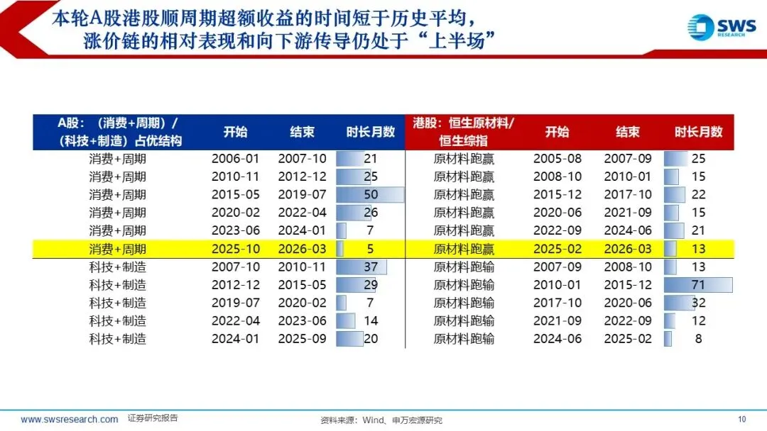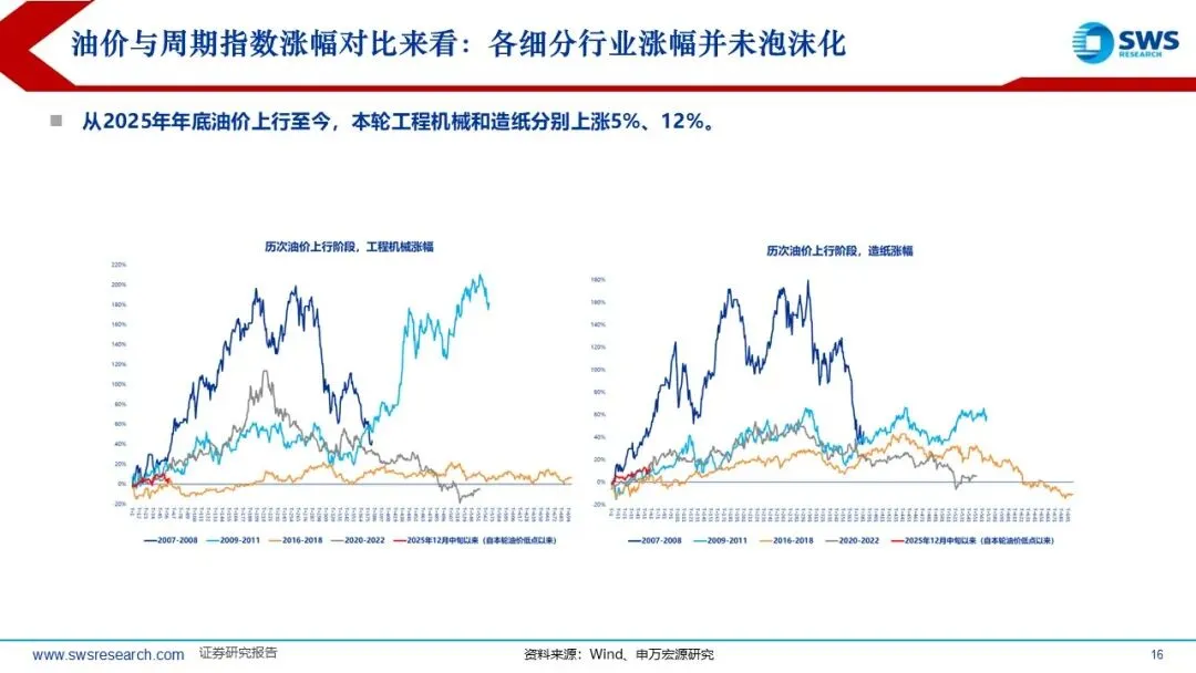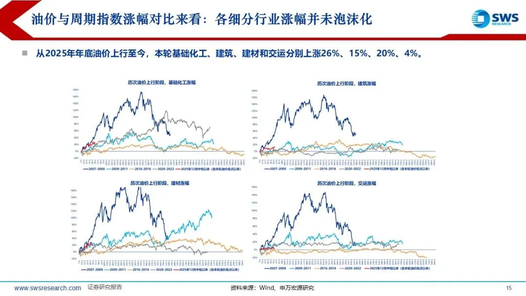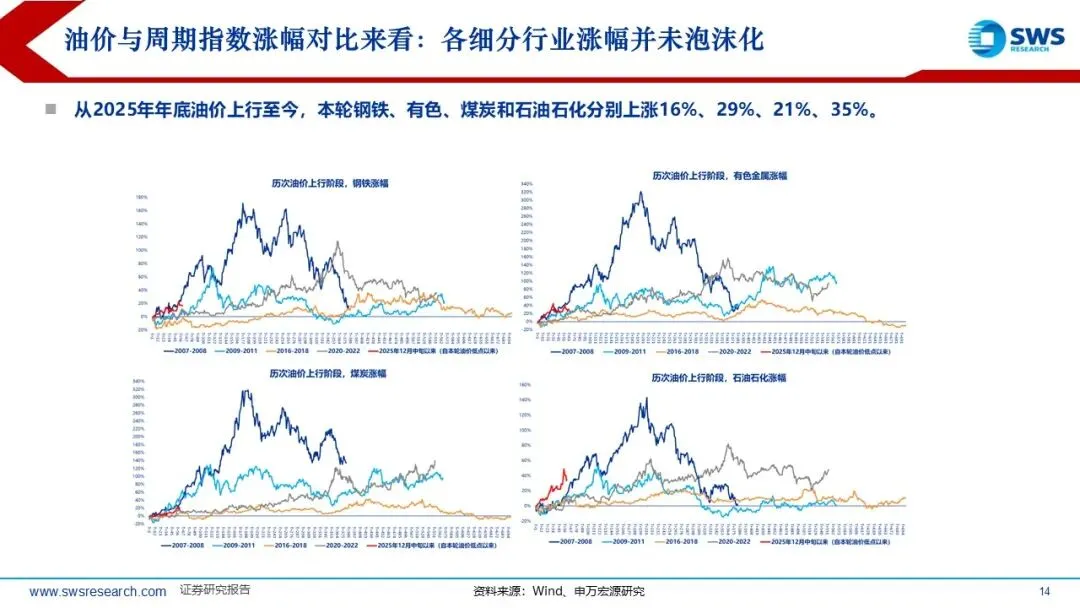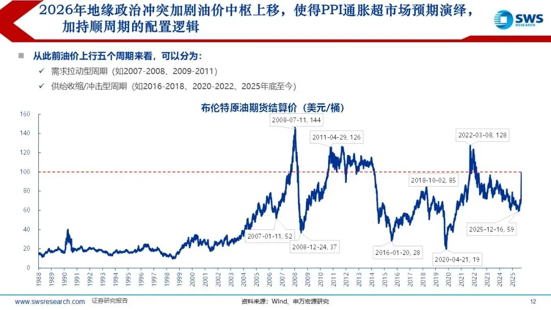 历史上PPI底部企稳回升阶段A股和港股的顺周期风格因子均占优:本轮A股港股顺周期超额收益的时间短于历史平均,油价从2025年底的60美元/桶左右迅速超过100美元/桶,但本轮顺周期上涨20%左右,还未充分仍在趋势中,涨价链的相对表现和向下游传导仍处于“上半场”。复盘过去油价上行阶段(2007-2008年、2009-2011年、2016-2018年、2020-2022年)的行业轮动顺序:通胀预期升温,资源品表现占优(有色金属、煤炭等);油价高位持续较长时间:经济可能进入滞胀阶段,防御性行业表现占优。如果油价上行主要受供给冲击,则行业轮动可能跳过预热期,资源品表现更直接。