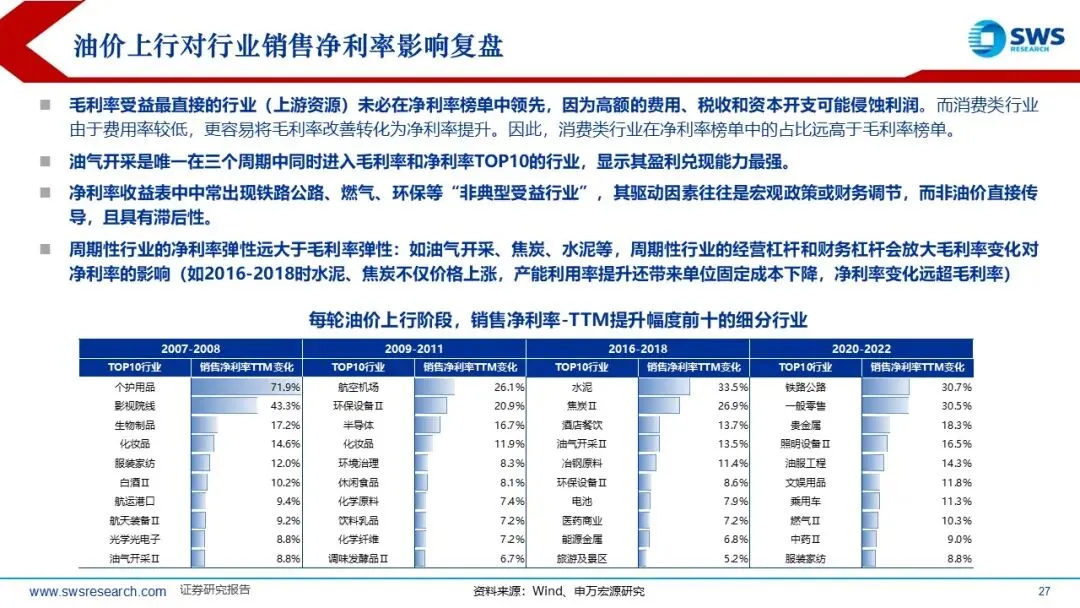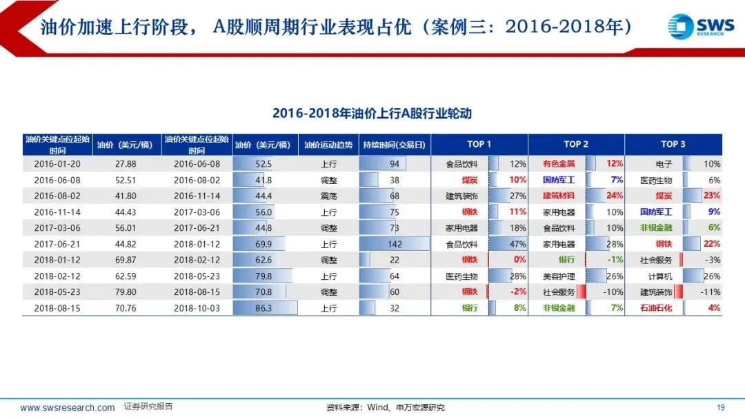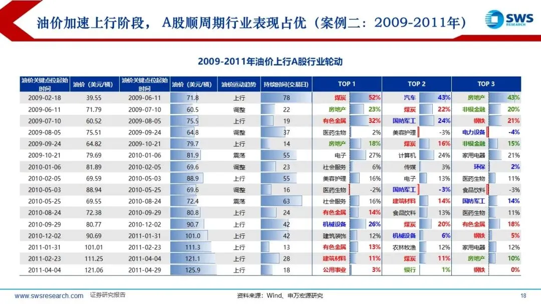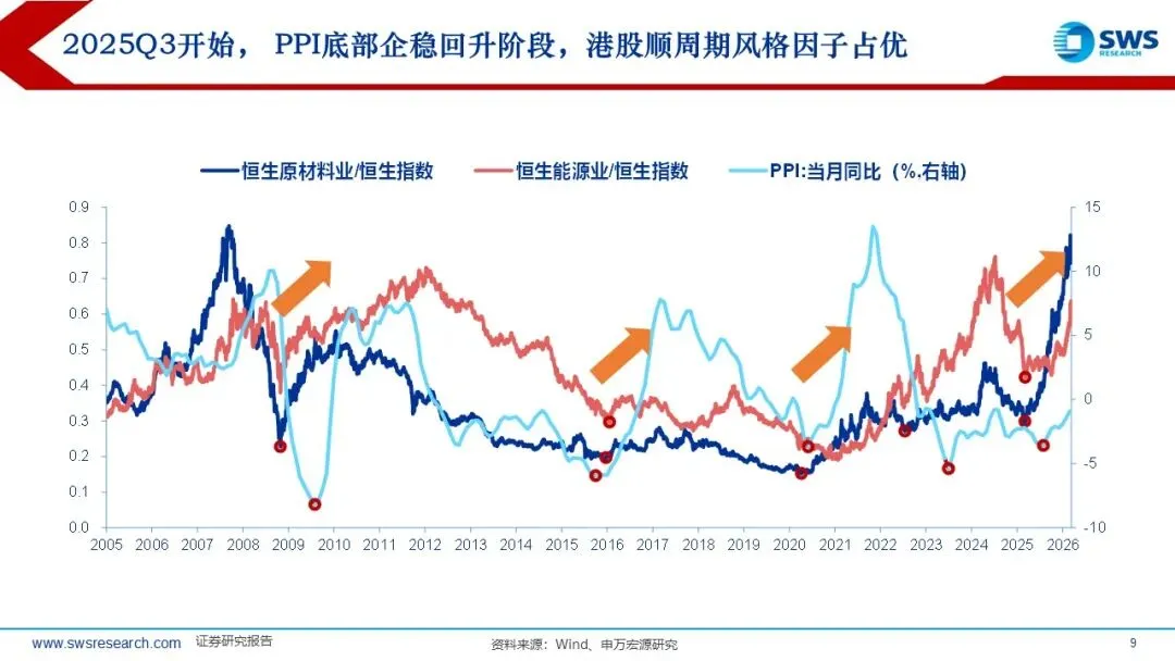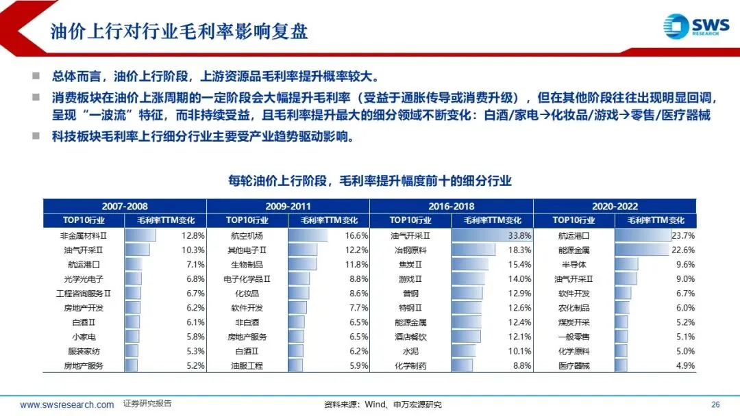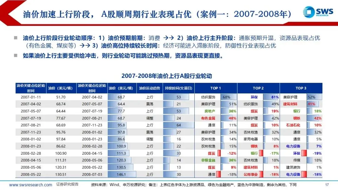 历史上PPI底部企稳回升阶段A股和港股的顺周期风格因子均占优:本轮A股港股顺周期超额收益的时间短于历史平均,油价从2025年底的60美元/桶左右迅速超过100美元/桶,但本轮顺周期上涨20%左右,还未充分仍在趋势中,涨价链的相对表现和向下游传导仍处于“上半场”。复盘过去油价上行阶段(2007-2008年、2009-2011年、2016-2018年、2020-2022年)的行业轮动顺序:通胀预期升温,资源品表现占优(有色金属、煤炭等);油价高位持续较长时间:经济可能进入滞胀阶段,防御性行业表现占优。如果油价上行主要受供给冲击,则行业轮动可能跳过预热期,资源品表现更直接。