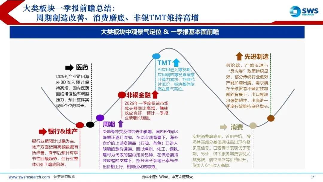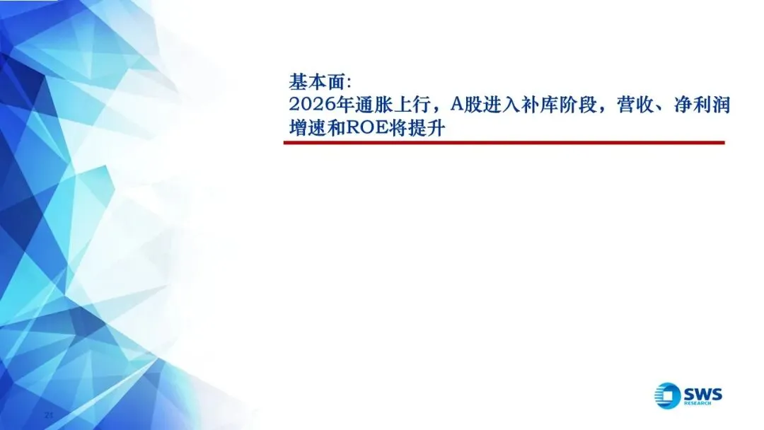 二、基本面:2026年通胀上行,A股进入补库阶段,营收、净利润增速和ROE将提升,一季报预计顺周期涨价链业绩亮眼,制造业持续底部改善,消费地产继续磨底、 非银TMT维持高增。