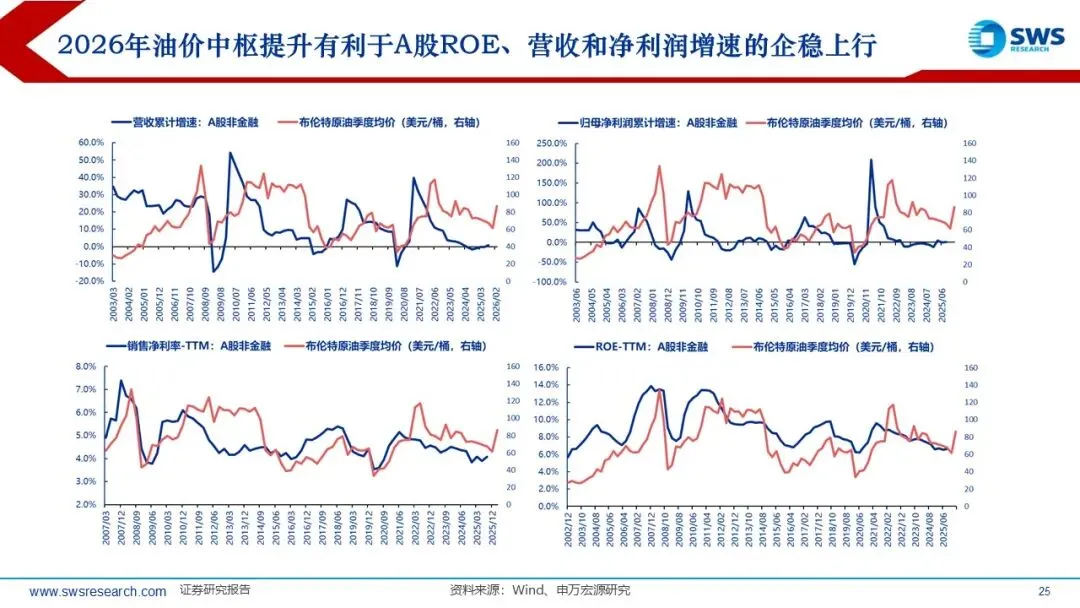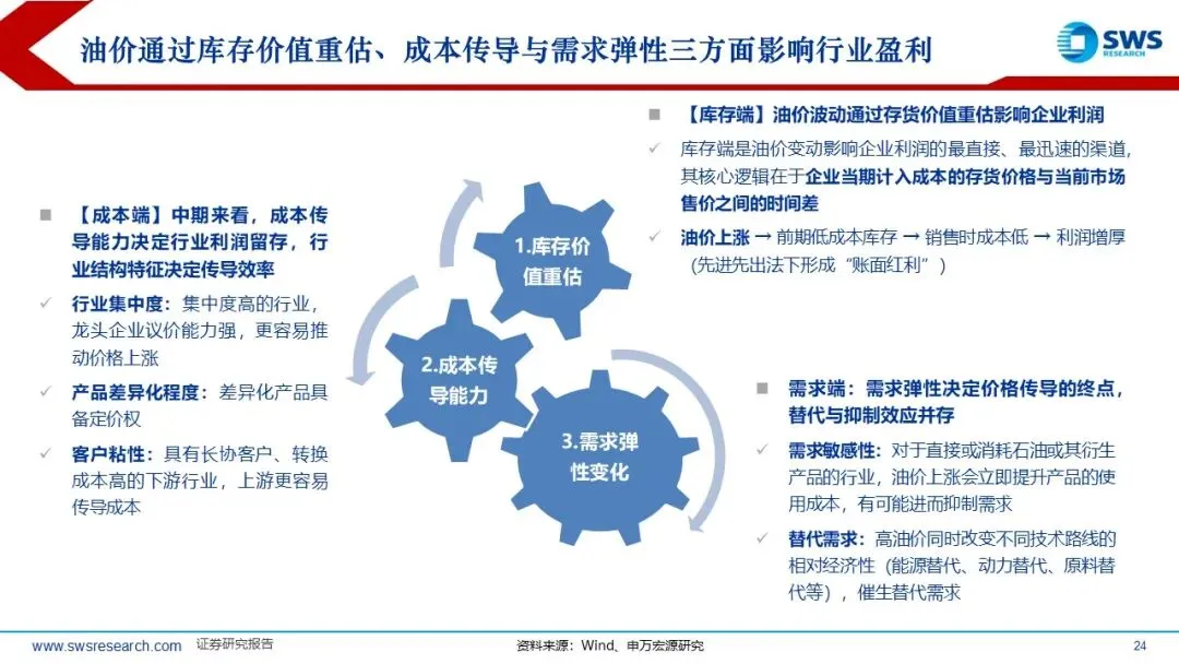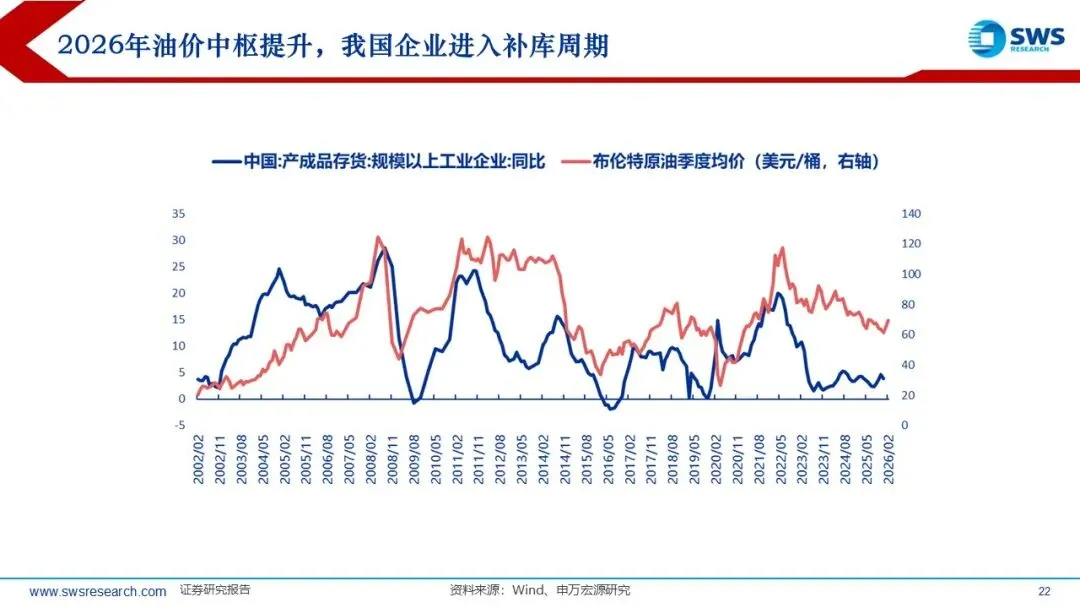 A股库存周期处于低位,2026年油价中枢提升,PPI改善带动企业回归补库周期;同时油价通过库存价值重估、成本传导与需求弹性三方面影响顺周期行业盈利。