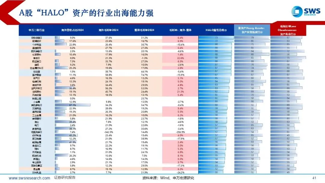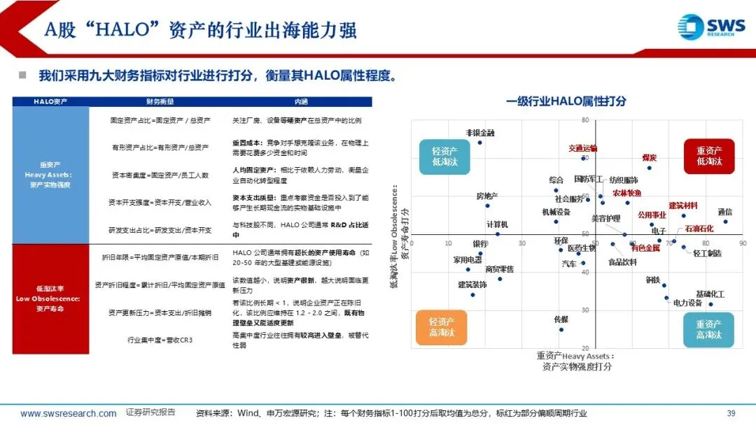A股当前“Halo”资产(重资产低淘汰率,两个维度财务打分均在45分及以上)的行业主要分布在:顺周期资源品的煤炭、有色、石油石化、建材,基础设施的公用事业、交通运输,品牌属性强的食品饮料等部分消费品。
