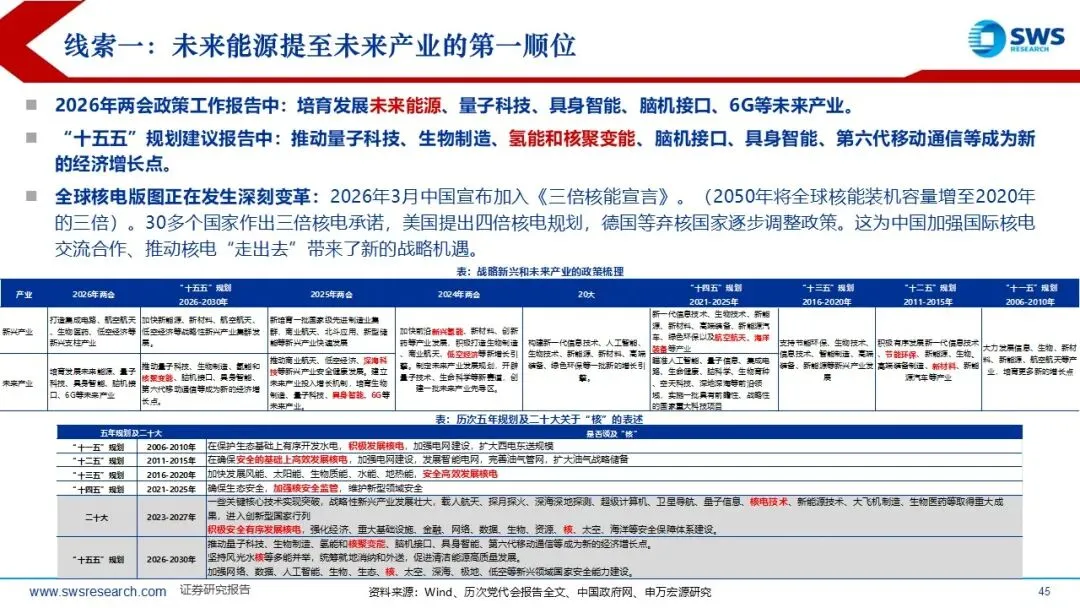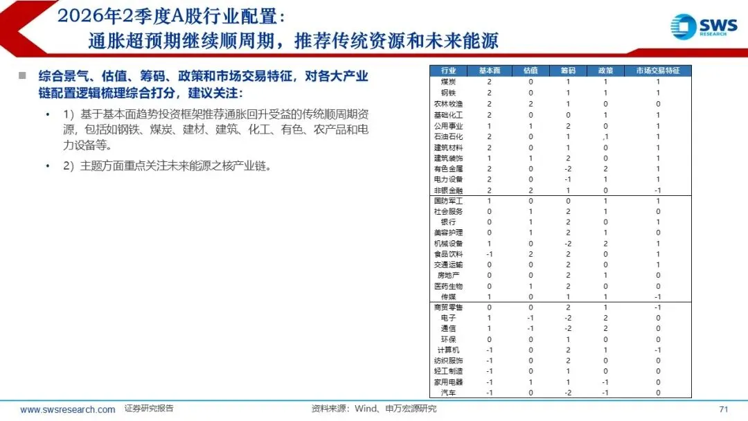 六、2026年Q2行业配置:通胀超预期继续顺周期,推荐传统资源和未来能源。基本面趋势投资框架推荐通胀回升受益的传统顺周期资源,包括如钢铁、煤炭、建材、建筑、化工、有色、农产品和电力设备等;主题方面重点关注未来能源之核产业链。
