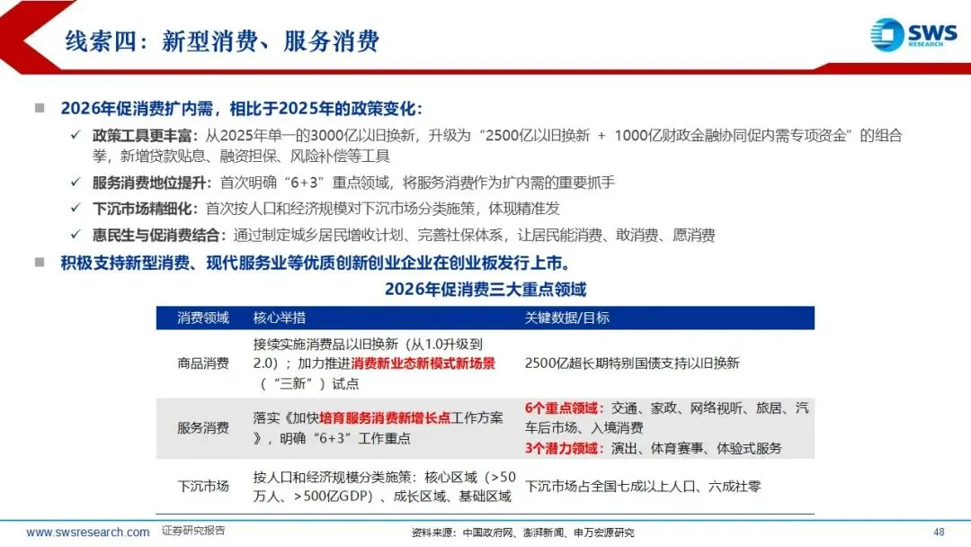 连续2年的首要任务强调着力建设强大国内市场: “购在中国”、“出口中国”、“投资中国” :1)未来能源提至未来产业的第一顺位,重点关注核相关产业链的长期投资机;2)首提“智能体”和“打造智能经济新形态”,重视我国智能制造的全球供应链优势;3)关注新型消费、现代服务业等优质创新创业企业上市带动消费品估值触底回升的机会。国际经验来看,消费具备从“生存”到“体验”演进变迁的共性,当前中国服务消费占比低,仍有扩张空间。