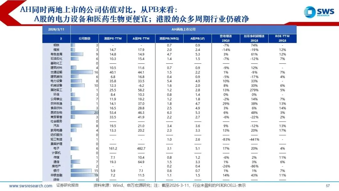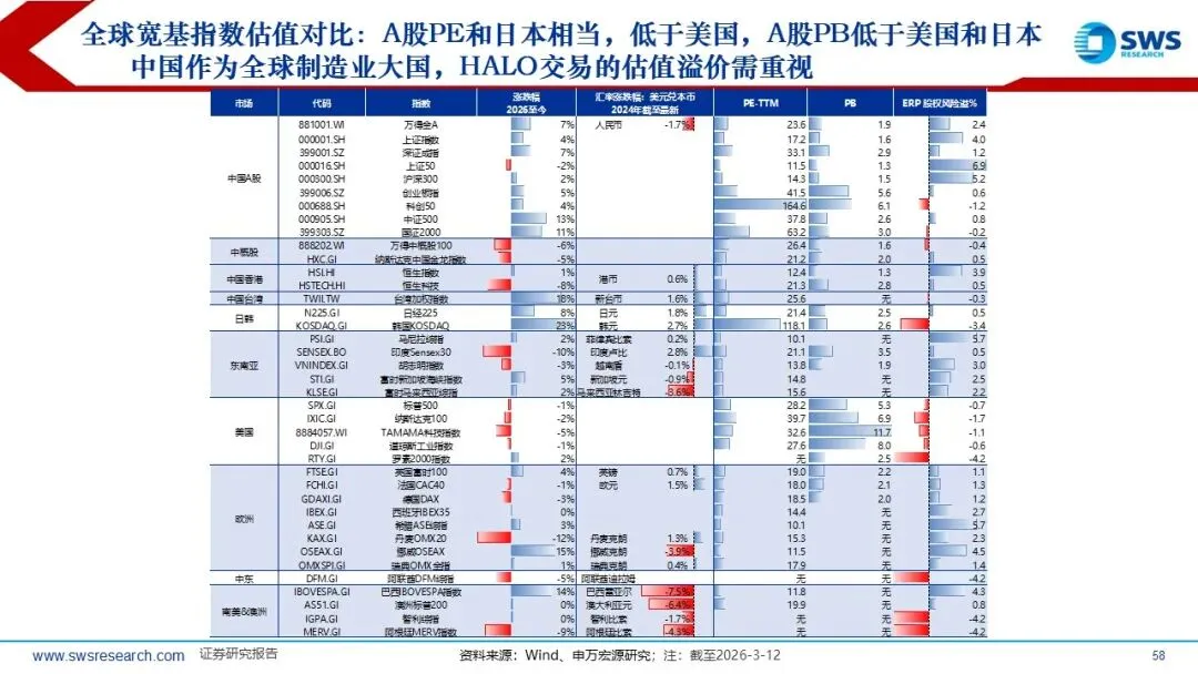 1)A股金融、消费、部分顺周期行业估值仍在历史中位数以下;2)AH上市公司估值对比,从PB来看A股的电力设备和医药生物更便宜;港股的众多周期行业仍破净;3)全球估值对比来看,中国作为全球制造业大国,HALO交易的估值溢价需重视;龙头公司对比,港股及A股传统行业相对较低(HALO交易相关行业集中在此),包括上游资源、化工、建筑与工程、机械、海运、港口、公路及物流基础设施,以及金融地产行业。