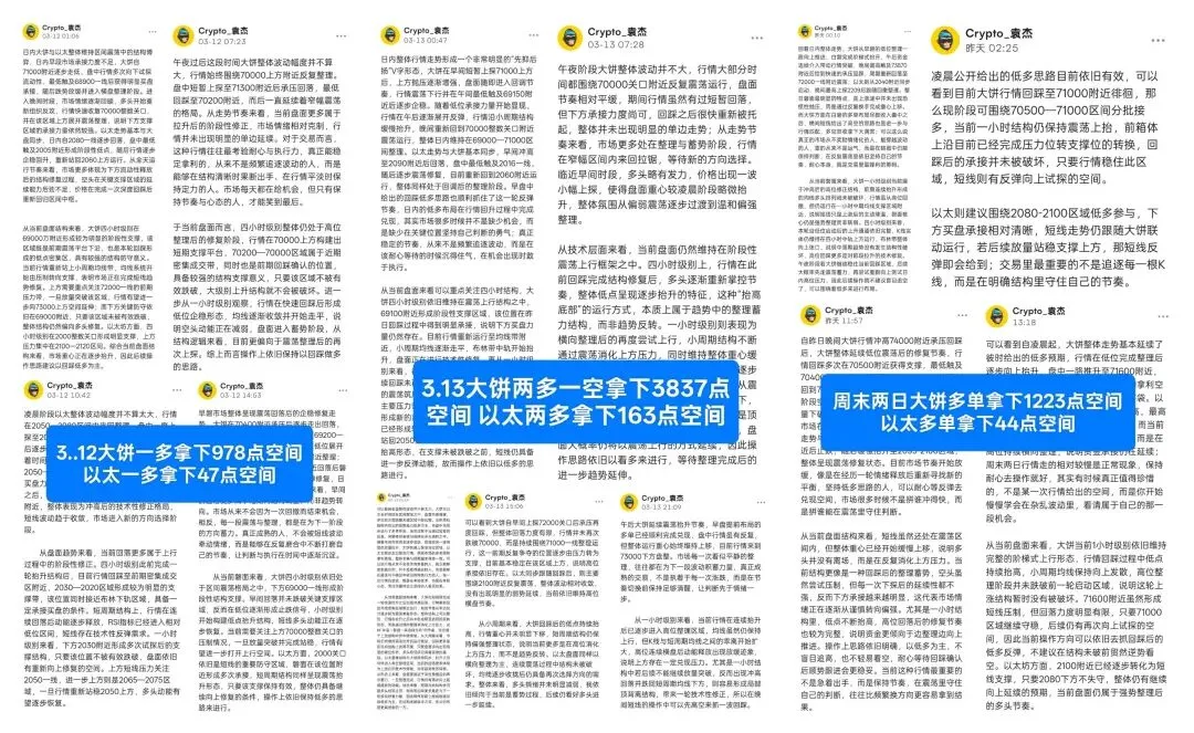 回顾本周行情大饼整体走出一轮先震荡抬升、后高位整理的结构,周初自65500附近止跌企稳后,行情逐步上移,中途虽伴随反复来回洗磐,但整体低点持续抬高,至周中放量突破72000关口,最高触及73870附近,随后高位出现获利回吐,行情回落至71000上方重新整理。以太走势与大饼基本保持同步,自1906附近逐步上行,周内最高冲至2209一线,随后回撤至2090附近震荡,整体同样维持高位整理节奏。从一周运行轨迹来看,市场并没有出现真正意义上的趋势转弱,更多是在连续上涨后进行高位换手,为下一阶段方向蓄势。