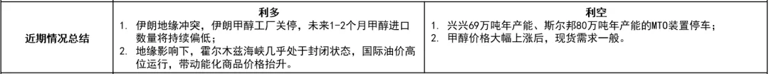 短期在伊朗地缘因素扰动下,霍尔木兹海峡几乎处于封闭状态,国际油价高位运行带动能源化工商品价格整体重心抬升,且伊朗作为国内甲醇主要进口来源国,地缘冲突下当地甲醇生产企业均处于关停状态,因此至少未来1-2个月国内甲醇的进口数量将持续偏低,这也将加大国内对存量甲醇货源的消耗,基本面预期向好,库存将有下降。因此短期在基本面及油价等因素的带动下,预计甲醇价格将整体偏强运行。(风险提示:关注伊朗地缘最新进展,若地缘缓和可能对甲醇价格带来明显利空扰动)