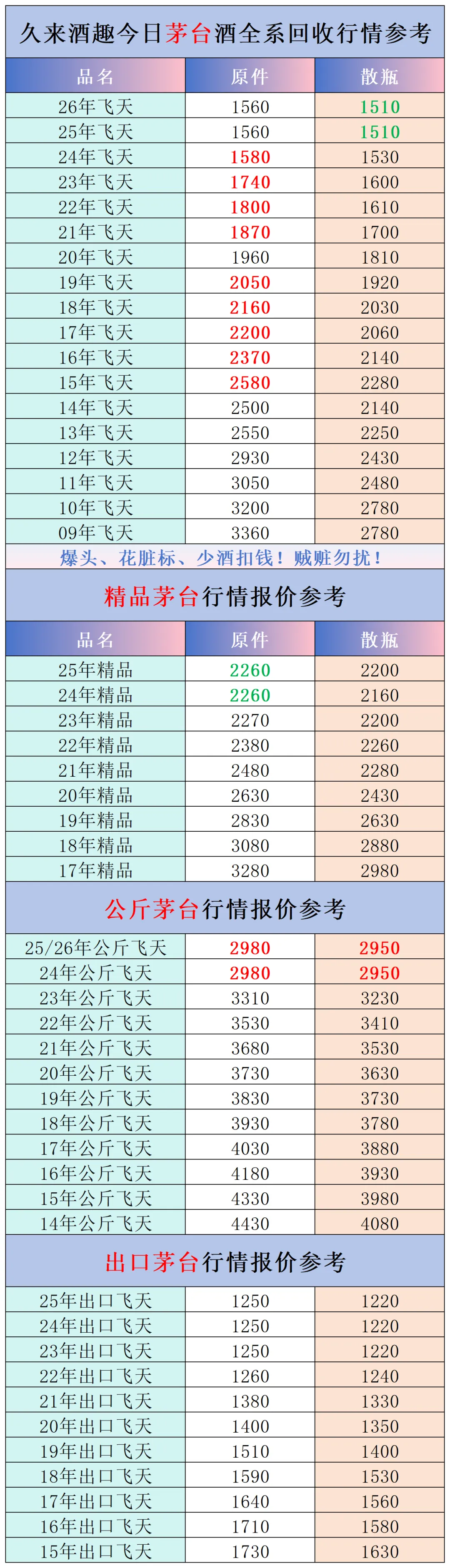 本公众号提供各种名酒回收行情报价,常规茅台、五粮液、洋河、剑南春、国缘等。所有报价根据市场买卖行情总结而来,每天更新最新报价!部分酒水每天涨跌幅较大,无法及时更新请谅解。本报价仅供参考,并非实际成交价格。感谢您的关注!我们会竭尽所能,提供更多更好的服务。