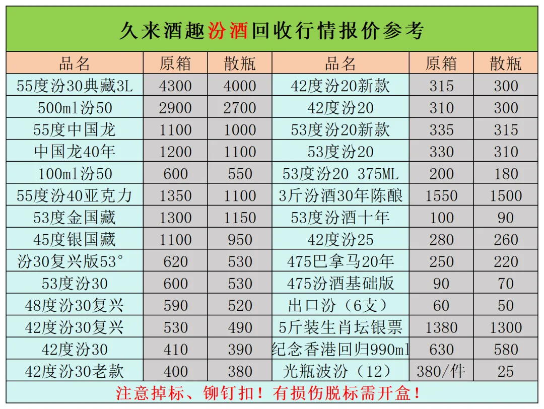本公众号提供各种名酒回收行情报价,常规茅台、五粮液、洋河、剑南春、国缘等。所有报价根据市场买卖行情总结而来,每天更新最新报价!部分酒水每天涨跌幅较大,无法及时更新请谅解。本报价仅供参考,并非实际成交价格。感谢您的关注!我们会竭尽所能,提供更多更好的服务。