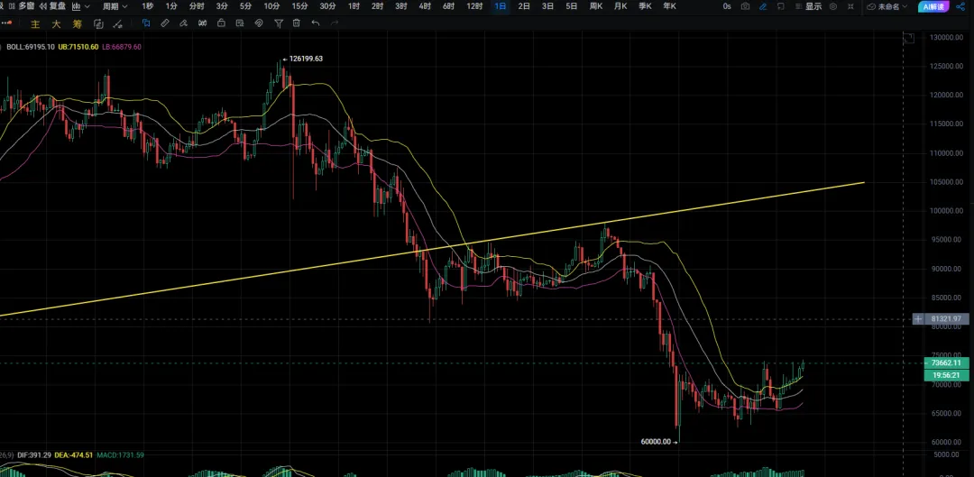 从当前盘面来看,下方关键支撑位在 71500 一线,这个位置目前仍然比较稳固。只要这一带不被有效跌破,整体结构就还在可控范围内。