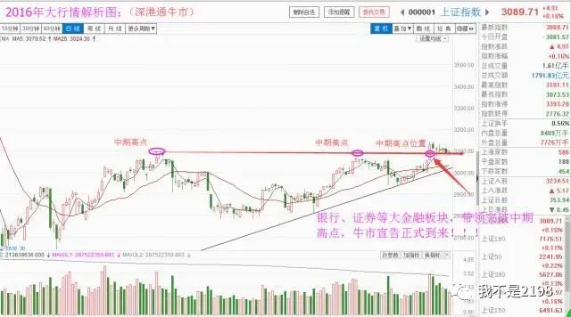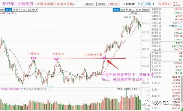 迹象一:牛市前端,各大蓝筹板块率先发力,突破中期的盘整高点,意味着牛市正式展开!