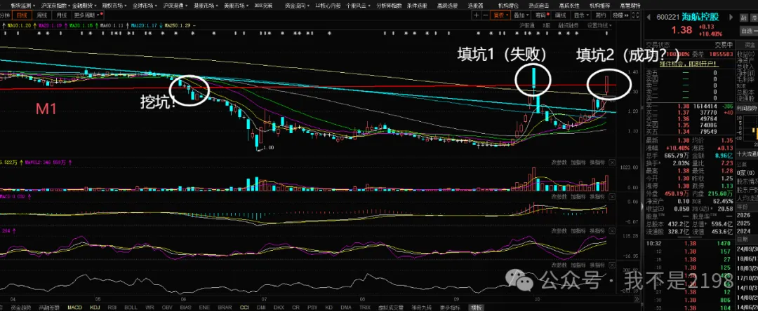 如图所示,今年6月5日,随着国际原油价格抬升,HHKG出现破位,跌破了M1,形成破底,生命线丢了,必须看作退市的预期,但只要主力不放弃,愿意继续在底部走出筑底形态,那么,站上5日线还是可以参与,随后在油价触底后,它开始填坑,第一填坑失败,随后再挖一次,结果这次随着以色列绕开伊朗的油田打击,伴随油价再次大跌,股价再次向上,今天,在三季报业绩大好的加持下,涨停,站上M1了!这种填坑,基本上无限接近有效,就等站稳后的确认回踩了。