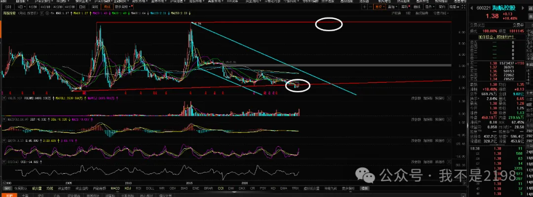 如果看月线的话,大家应该会继续HHKG当时我是怎么跟大家聊的,其他它的机会就两个,一个是红色通道下轨的圆圈处做一次买入布局,然后拿住等待股价突破多瑙河后起飞,最后在红色的通道上轨处卖出,多么简单的作业,但考验的就是大家的耐心,因为买它可能会有好长时间看不到大涨行情,要煎熬,尤其是多瑙河都没越过去之前,必须是反复磨底,主力也要吸筹,最最最重要的是,它之前也跌破M1了,虽然存在退市风险,只有站回M1,才是真的起色回升,好在这一切都如我们的预期那样,都要慢慢实现了。