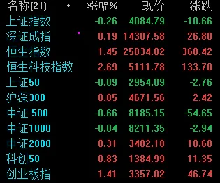指数方面,主要指数涨跌不一,其中创业板上涨1.41%,涨幅最大,中证500下跌0.66%,跌幅最大。