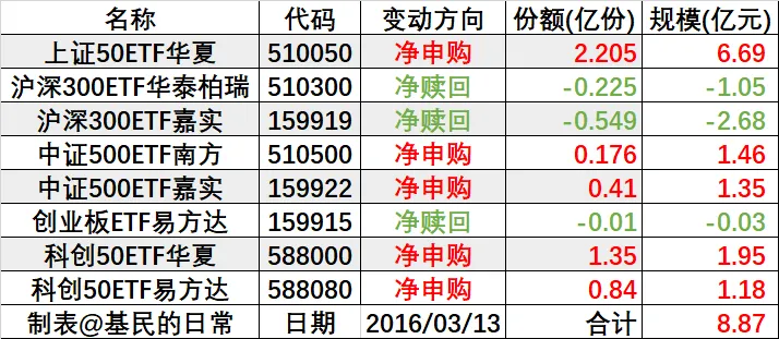 申赎方面,上证50由净赎回转为净申购,沪深300连续6个交易日净赎回,中证500净赎回转为净申购,创业板由申购净转为净赎回,科创50连续3个交易日净申购。