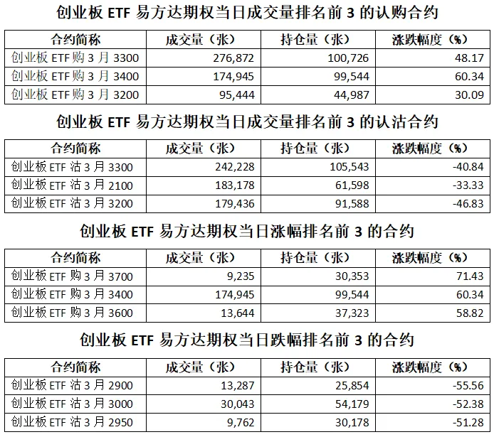 创业板ETF易方达期权总成交面额586.76亿元,增加27.59%,期现成交比为0.28,权利金成交额8.98亿元;期权总成交量1,875,787张,增加28.73%,其中认购期权成交量779,179张,认沽期权成交量1,096,608张,认沽认购成交比率为1.41(上一交易日认沽认购成交比率为1.31)。