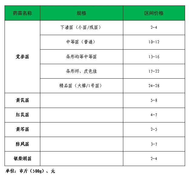 下方表格里,我们整理了近期市场上热门药苗的报价,包括党参、黄芪等常见品种,价格结合了首阳、菜子交易市场及上门收购的最新情况,供大家参考。