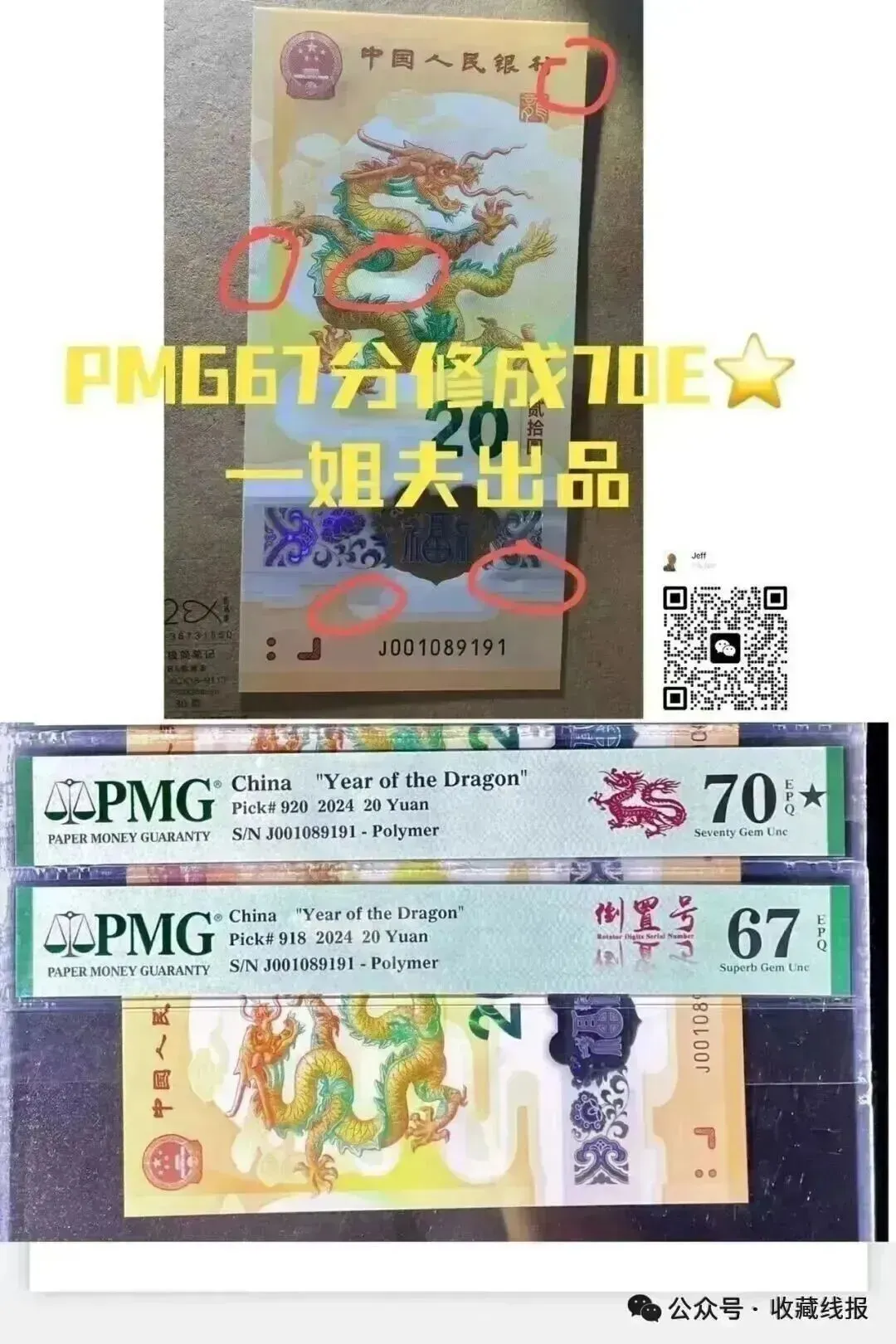 今天强哥分享一个低调宝藏修币大师彭总,人帅技术好,本来靠颜值吃饭偏偏靠修钞技术打了一片天下。上一期PMG67分提分到68分的概率非常高,有一种技术叫专业。有一个藏友别人给他修了2次都是PMG67分,彭总一次修PMG70分。彭总是值得我们信任的合作伙伴,有修龙钞蛇钞版币的朋友粉丝,联系我微信:sanba365,价格优惠多多,让你的龙钞蛇钞低分变高分不再是难事。