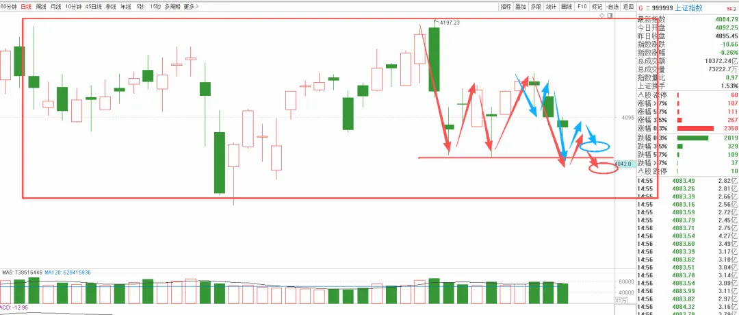 上证指数今天是出现了一根大长腿,对于这种走势其实没啥太多要说的,上周五没有复盘,复盘也就是这句话,等待回调之后出现买点低吸的机会。今天有朋友迷茫,在问,为啥我觉得这里可以低吸,首先我要告诉大家,这不是我说的算,我只是根据自己的体系,是市场告诉我的,我只是归纳而已,也不能确定一定是对。那么技术面可信度就会高一些,你们认真看。技术面:我用的是日线图,去死很明了,这是一个震荡的区间,震荡走势,中枢结构。红色是30分钟级别,蓝色是5分钟级别,那么看得出来,30分钟级别走的是一个a段下跌中枢,5分钟级别走的是一个b段下跌。所以,我们操作很明白的,大级别震荡,中级别下跌中继,小级别下跌中继,那么我们有开仓理由吗?所以我告诉大家的策略很明白,不追高,也不杀跌,更不会去加仓或者买入。但是他回调不破,或者不破不立,结构走完了,那么就是机会了。今天早盘,1分钟到5分钟级别单边下跌,直接破了4052位置,一直惯性下杀到了4048,这种杀跌正常吗?正常的,为什么?因为5分钟级别b段下跌么,比a段跌的厉害很正常,同时他破了4052等于是叠加了30分钟级别的b段下跌,所以,这种b中b的下跌结构我们在很早之前就说的明白,这是一种空+空的组合是很容易形成杀跌,暴跌,单边下跌,恐慌性下跌的这种走势,但是今天有吗?显然没有,甚至在午后还一度冲击开盘价,说明市场的承接和认同还是一致的,这个位置跌不下去,收盘虽然指数绿但是盘面已经涨多跌少了。这时候的情况就不一样了,没跌破说明还是走的中枢,那么走中枢的最低位现在是4048,最高卫视4141,接下去不论是走30分钟级别的震荡,还是走5分钟级别的反弹,小的趋势都在改变,从原来的下跌,变成企稳了,今天5分钟级别通过一下午的反弹确认b段下跌完成,再下跌就是c段,背驰段碰到30分钟级别震荡底部,如果30分钟级别也通过震荡确认背驰出现,那么双背驰不就是短线我们可以去进行买入的依据吗?接下去只要不是破位大暴跌,那么破不破我们都是有足够操作空间了不是么。