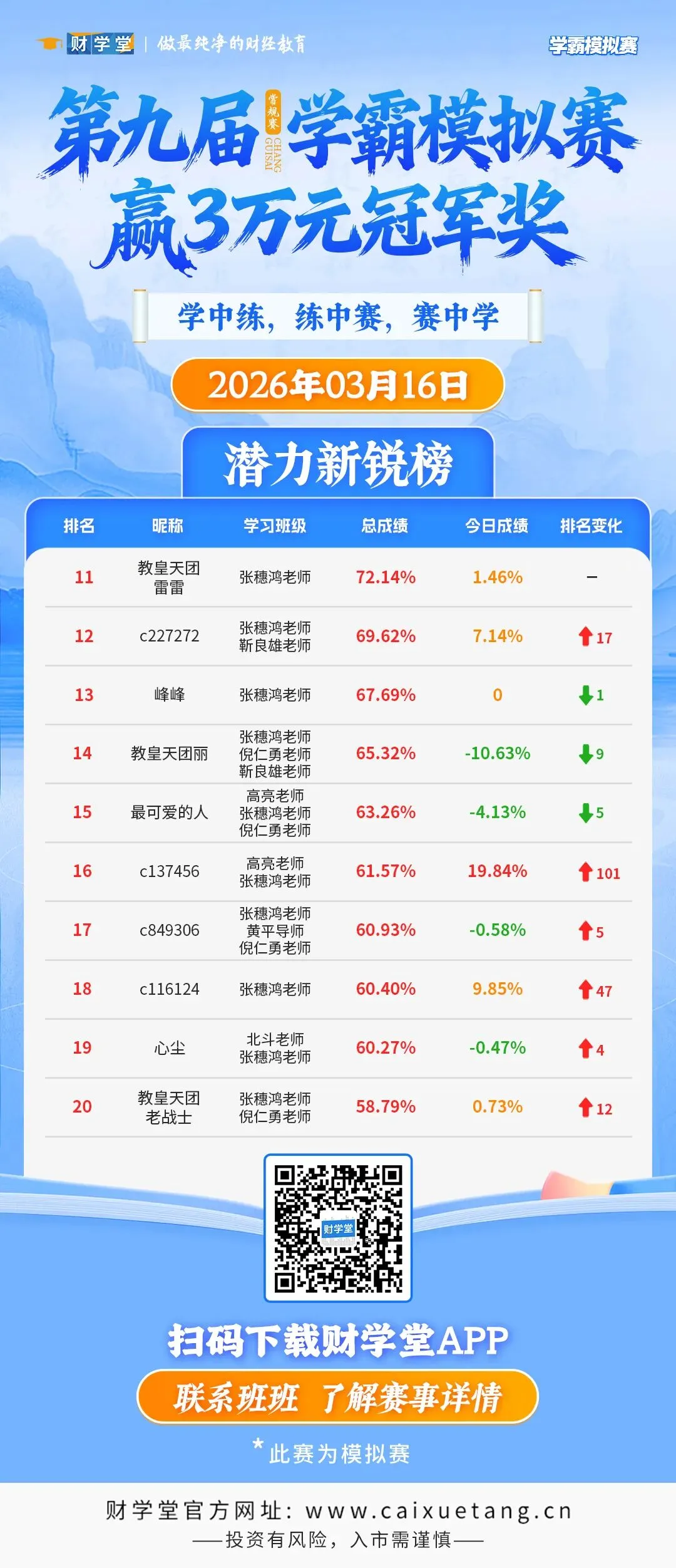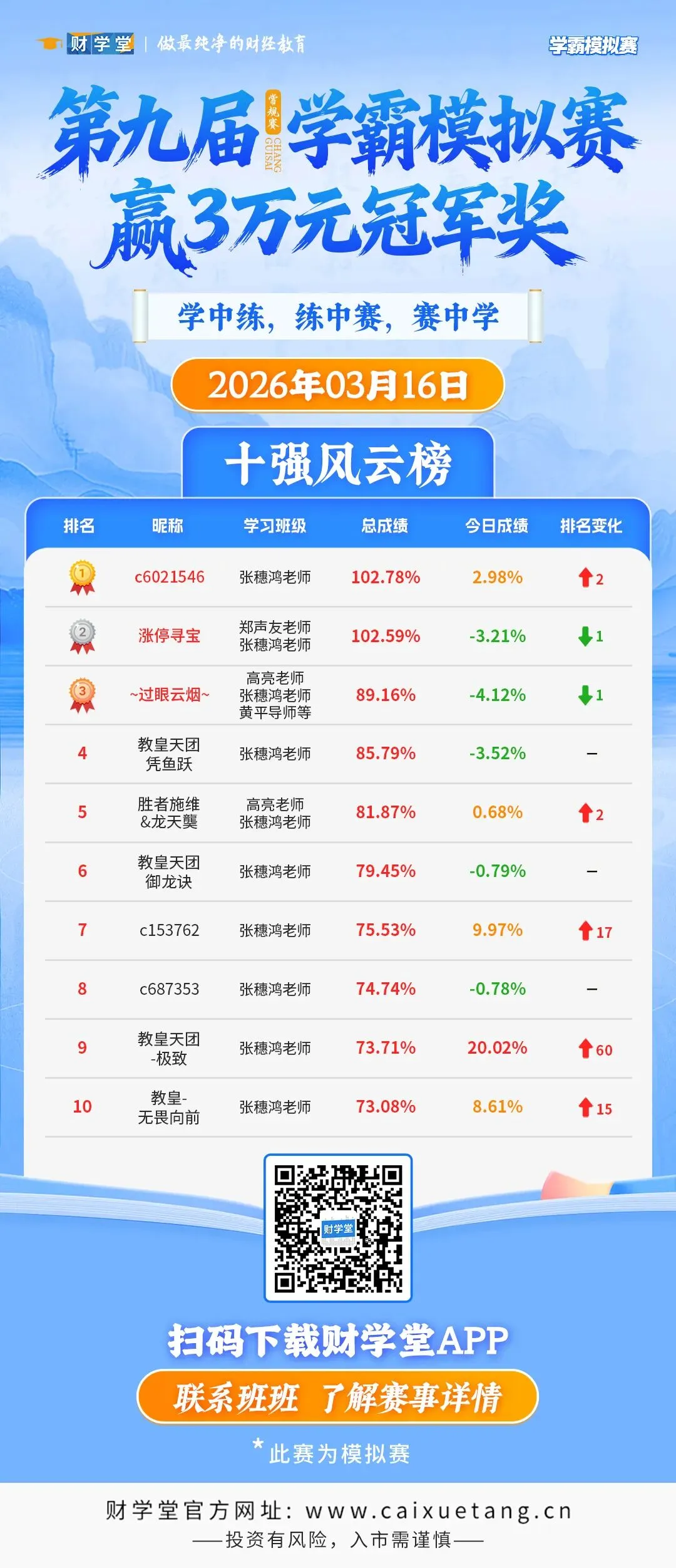 第九届“学霸模拟赛”比赛来到第6个交易周周一,新的一周正式开启。今天市场整体以震荡为主,指数小幅波动,个股涨跌分化明显。在这样的行情里,榜单里的操作节奏反而更值得看看。