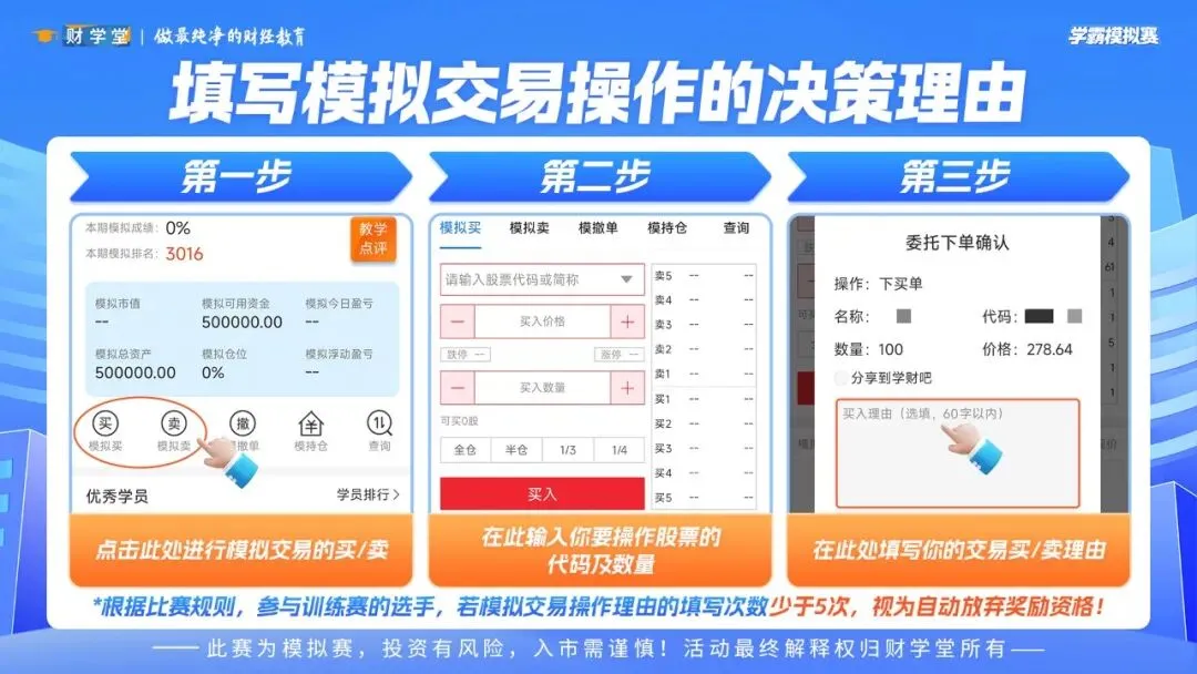 为帮助大家更好地梳理交易思路、提升操作能力,每完成一笔买入或卖出时,请务必填写交易理由。累计填写不少于5次交易理由,才具备排名奖的评选资格。若少于5次,将视为自动放弃奖励资格哦!认真记录、持续复盘,学习和实操才能真正结合,越坚持,收获越多!