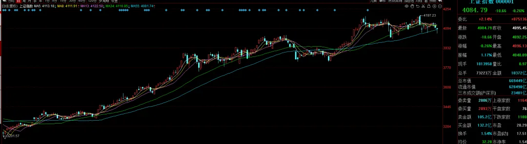 今日大盘呈现探底回升态势,60日均线连续三日收出下影线,支撑作用逐步显现。指数开盘后小幅低开,随即展开下行调整,盘中一度下探至4052.55点,在60日线附近经历多轮震荡整理后,午后逐步发力回升,最终再度收出下影线,形成三连下影的格局。从量能表现来看,市场交投持续萎缩,全天成交额维持在2.3万亿水平。值得注意的是,4052.55点附近不仅有60日线的支撑,同时也是月线级别的重要支撑位。
