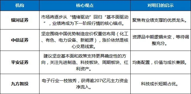 预判结论:明日市场大概率以震荡修复、科技占优为主基调。银河证券指出,在A股自身韧性和“以我为主”的内涵支撑下,后续市场将逐步从“情绪驱动”回归“基本面驱动”,业绩将成为下一阶段行情的核心锚点。