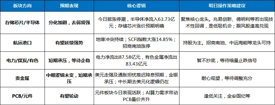 综合今日资金流向与机构观点,半导体/存储芯片短期占优,航运港口地缘驱动延续。明日操作中应坚持: