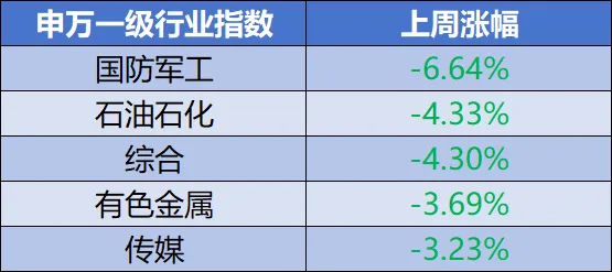 上周跌幅前5的行业分别是:国防军工、石油石化、综合、有色金属、传媒。