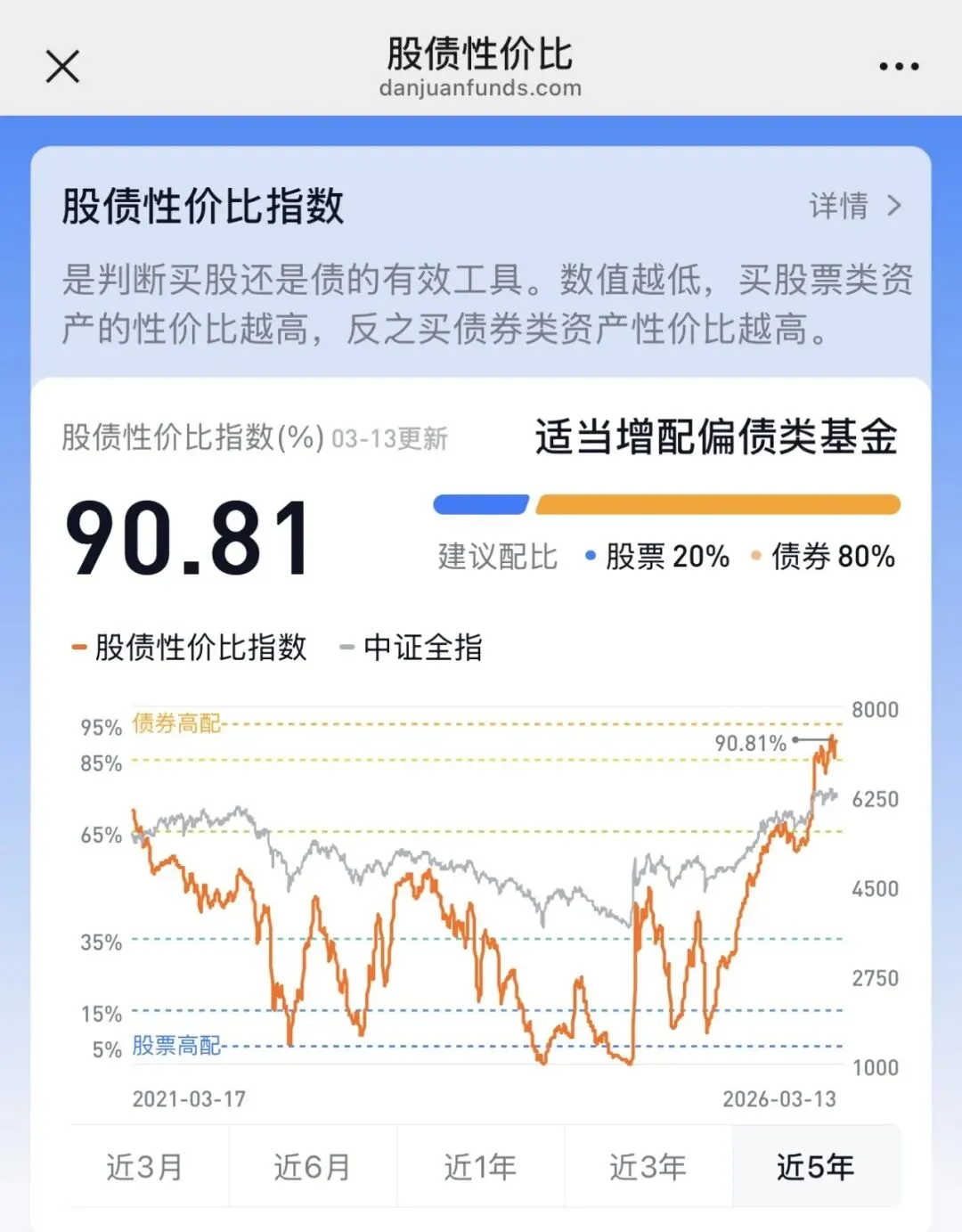 根据雪球股债性价比指标,目前股债性价比指数90.81%,建议适当增配偏债类基金。