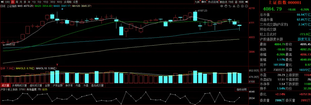 三市成交2.34万亿,相较前一日缩量773.9亿,沪指盘中跌破前低,最低到4048点后,沿60日线修复,短期看这个位置支撑有效,虽日内承接不错,但并非意味着调整结束,短线规避高位股调整风险。4050附近短期看是强支撑点,后续重点关注,如果破了这个点要非常谨慎起来,再看创业板指数全天强势震荡收涨1.41%,受科技成长股走强创业板相对抗跌。