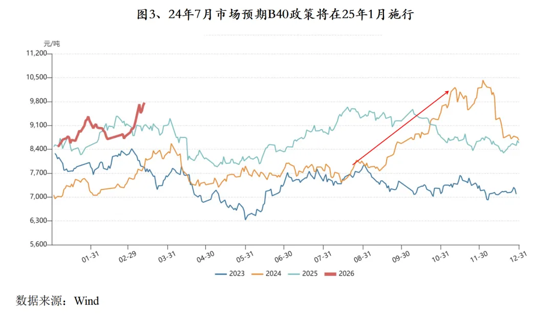 更为关键的是,印尼政府正考虑加快推进生物柴油掺混比例提升。在B40(掺混40%)基础上,可能通过B45(45%)作为过渡,最终向B50(50%)甚至B60(60%)迈进。能源部长巴赫利尔明确表示,预计将在2026年下半年完成B50计划的测试。即在2025年已实施的B40(掺混40%)基础上,政府正评估于2026年将掺混比例提升至50%的可能性。若实施B50,印尼全年生物柴油需求将从B40政策下的1560万千升增至约1900万千升,国内棕榈油消费或增加约300万吨。据印尼棕榈油协会(GAPKI)估算,实施B50每年将需要约1600万吨毛棕榈油作为原料,占当前产量的近30%。这一政策预期若兑现,将显著收紧全球棕榈油可出口供应量,为价格提供强支撑。